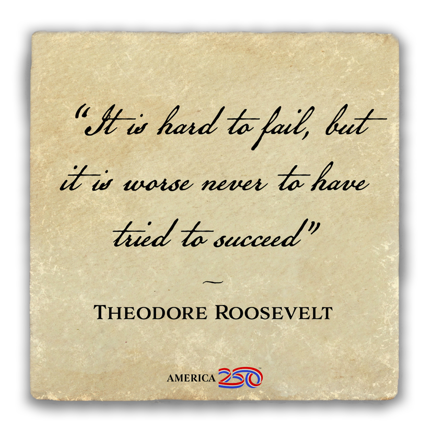 This tumbled stone coaster features the quote from Theodore Roosevelt: "It is hard to fail, but it is worse never to have tried to succeed". Save your counter from spills and stains with these patriotic-themed coasters, or buy some as a gift for a friend! Each coaster is 4 in. x 4 in. and stands 1/2 in. high. As these are cut from real rock, the white flecks and edging on each one will be unique. They are easy to clean, and come with a cork bottom to prevent slipping, and heat transfer. You can buy them in singles or packs of 4. ( COAST2-AM105 ) The AMERICA 250® word mark and logo are trademarks of the U.S. Semiquincentennial Commission and are used by Nelson Enterprises under license.