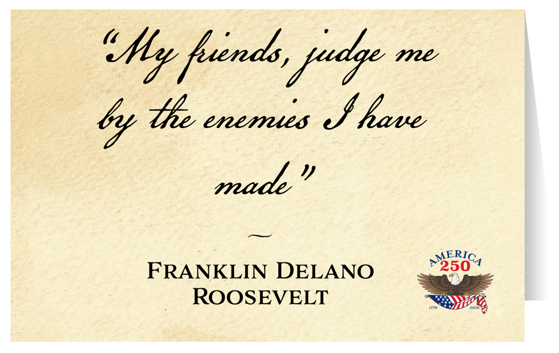 Send thanks, congratulations, greetings, and more to friends and family with these Patriotic Note Cards! The front features the quote from Franklin Delano Roosevelt: "My friends, judge me by the enemies I have made". The inside is blank. Printed on heavy cardstock, this 4.25"x5.5" card comes with envelopes, and can be bought individually or in bundles of 6.  ( STCA-AMERICAN109 ) The AMERICA 250® word mark and logo are trademarks of the U.S. Semiquincentennial Commission and are used by Nelson Enterprises under license.