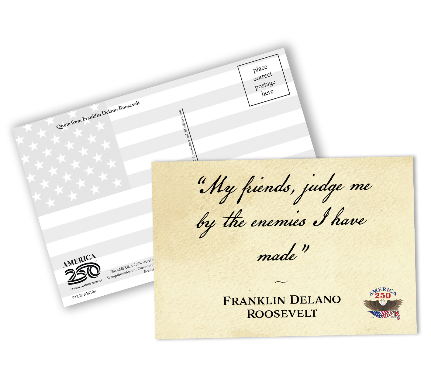 Send a message to friends and family with these Patriotic Postcards! The front features the quote from Franklin Delano Roosevelt: "My friends, judge me by the enemies I have made".  These postcards can be bought as singles, or in a bundle of a dozen.  ( PTC-AM109 ) The AMERICA 250® word mark and logo are trademarks of the U.S. Semiquincentennial Commission and are used by Nelson Enterprises under license.