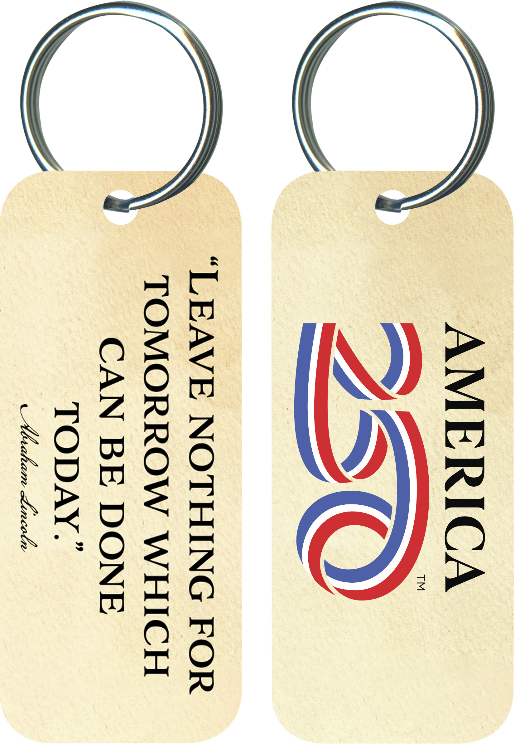 Proudly display your patriotism everywhere you go with this unique, glossy keychain! This high-quality, beautiful gift makes a great addition to your keychain and the perfect gift for the drivers in your circle of family and friends! This keychain features the quote from Abraham Lincoln: "Leave nothing for to-morrow which can be done to-day".  ( KCO-AM80 ) The AMERICA 250® word mark and logo are trademarks of the U.S. Semiquincentennial Commission and are used by Nelson Enterprises under license.