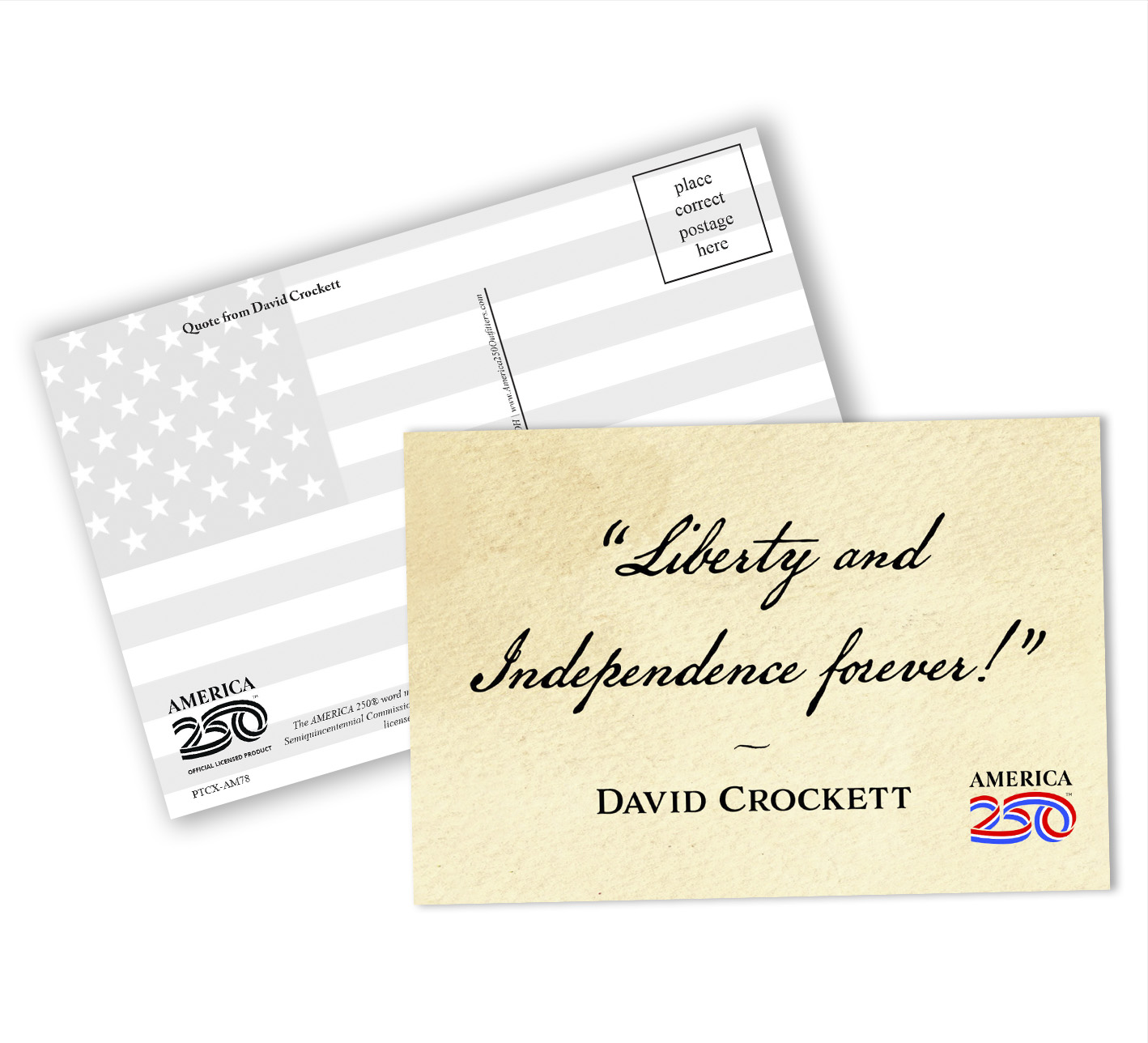 Send a message to friends and family with these Patriotic Postcards! The front features the quote from David Crockett: "Liberty and Independence forever!".  These postcards can be bought as singles, or in a bundle of a dozen.  ( PTC-AM78 ) The AMERICA 250® word mark and logo are trademarks of the U.S. Semiquincentennial Commission and are used by Nelson Enterprises under license.