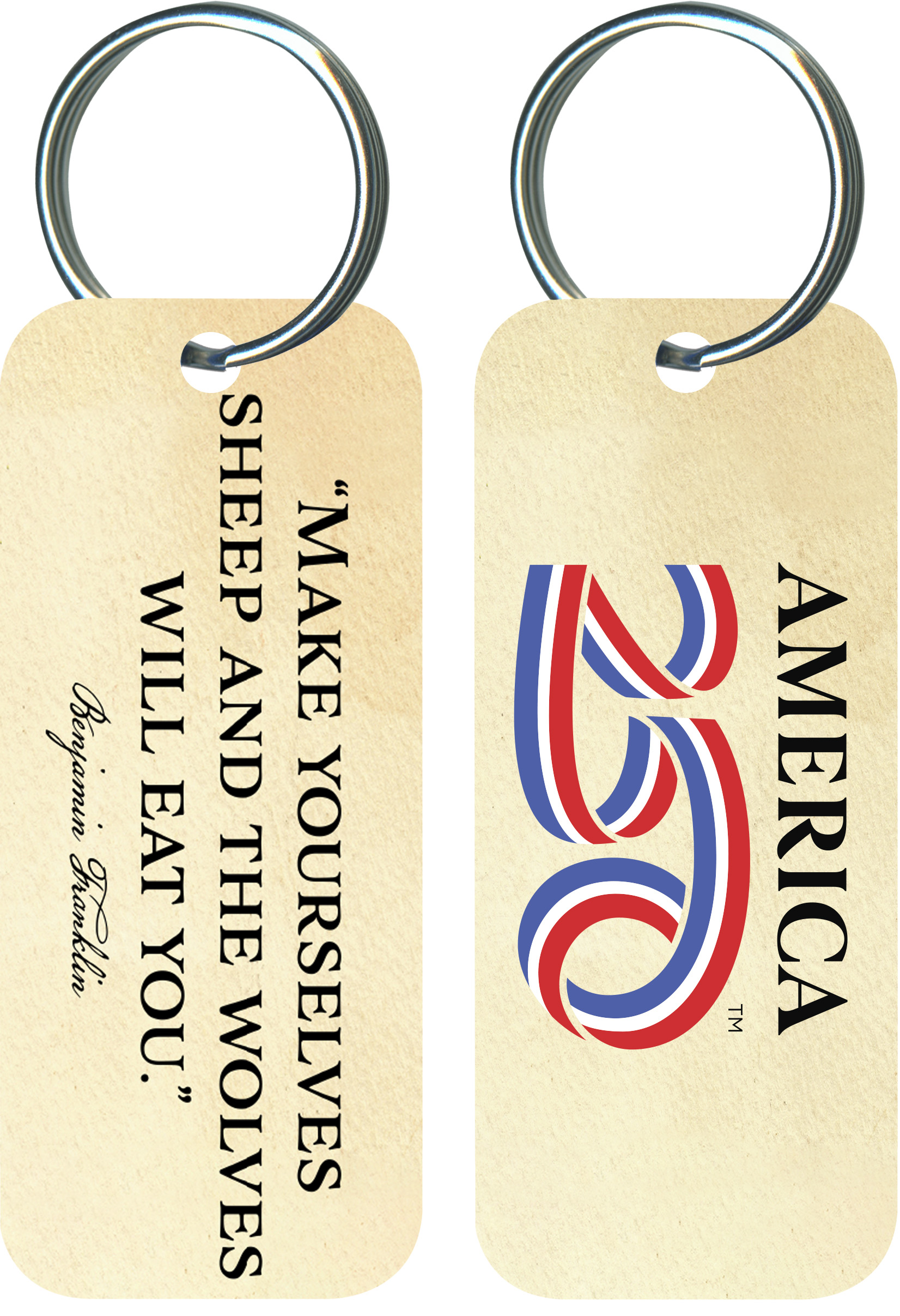 Proudly display your patriotism everywhere you go with this unique, glossy keychain! This high-quality, beautiful gift makes a great addition to your keychain and the perfect gift for the drivers in your circle of family and friends! This keychain features the quote from Benjamin Franklin: "Make yourselves sheep, and the wolves will eat you."  ( KCO-AM37 ) The AMERICA 250® word mark and logo are trademarks of the U.S. Semiquincentennial Commission and are used by Nelson Enterprises under license.