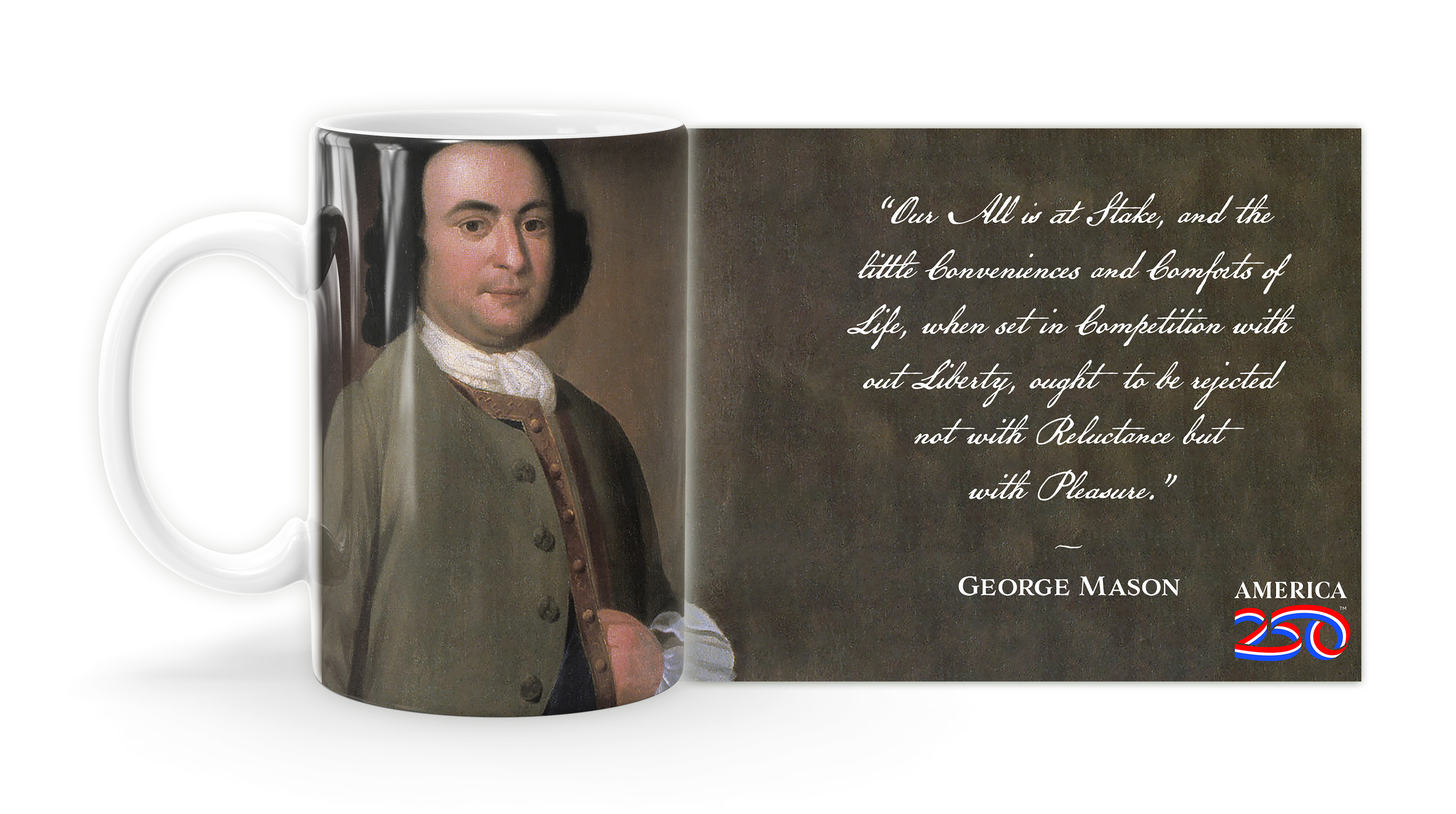 Enjoy your coffee, tea, and hot cocoa in this unique ceramic mug. This 15 oz. high quality coffee mug imprinted in our shops makes a great gift for any event or occasion! This mug features the George Mason Quote “Our All is at Stake, and the little Conveniences and Comforts of Life, when set in Competition with our Liberty, ought to be rejected not with Reluctance but with Pleasure” ( MUG15X-AM236-56 ) The AMERICA 250® word mark and logo are trademarks of the U.S. Semiquincentennial Commission and are used by Nelson Enterprises under license.