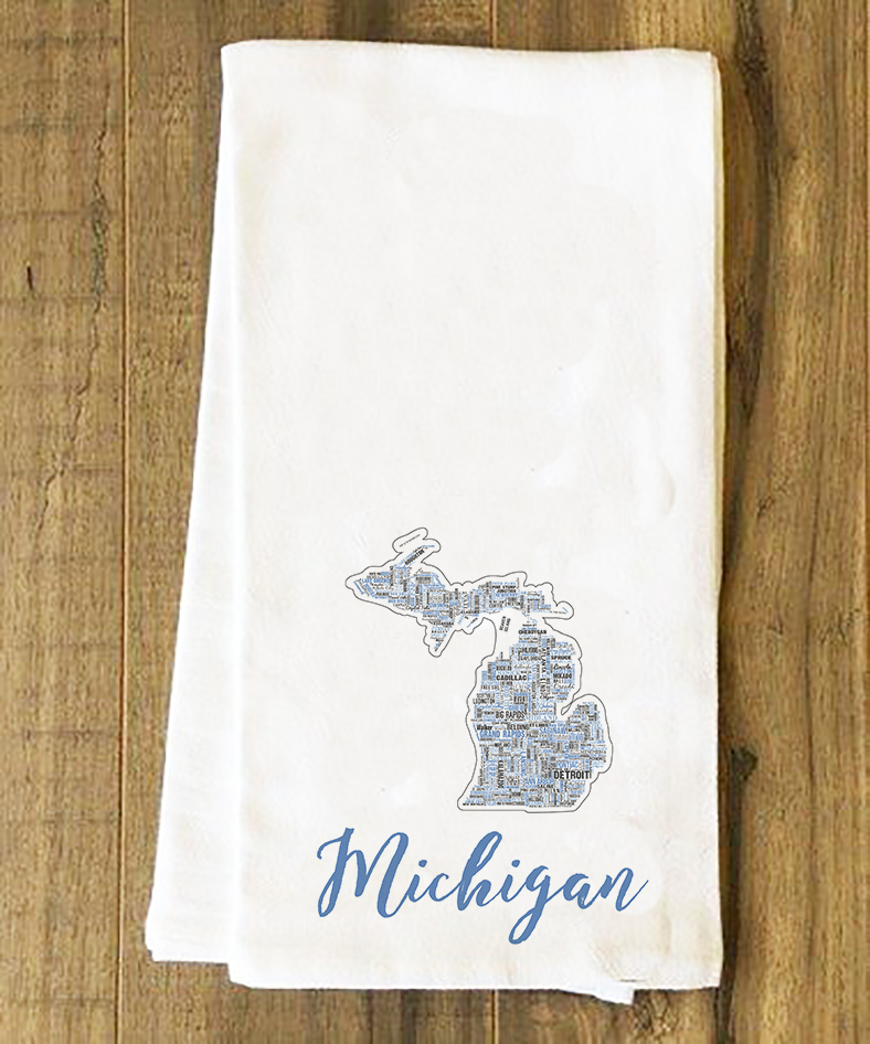 Show off your state pride with these tea towels! This tea towel features the names of cities in Michigan. These 28" x 29" flour sack towels are 100% cotton, making them lint free, highly absorbent, quick drying, shrink resistant and extremely versatile. They're excellent for wiping up water, drying dishes, and lining baskets full of cookies, and much more. All towels are machine washable, bleed-resistant, and printed in Steubenville, OH.
