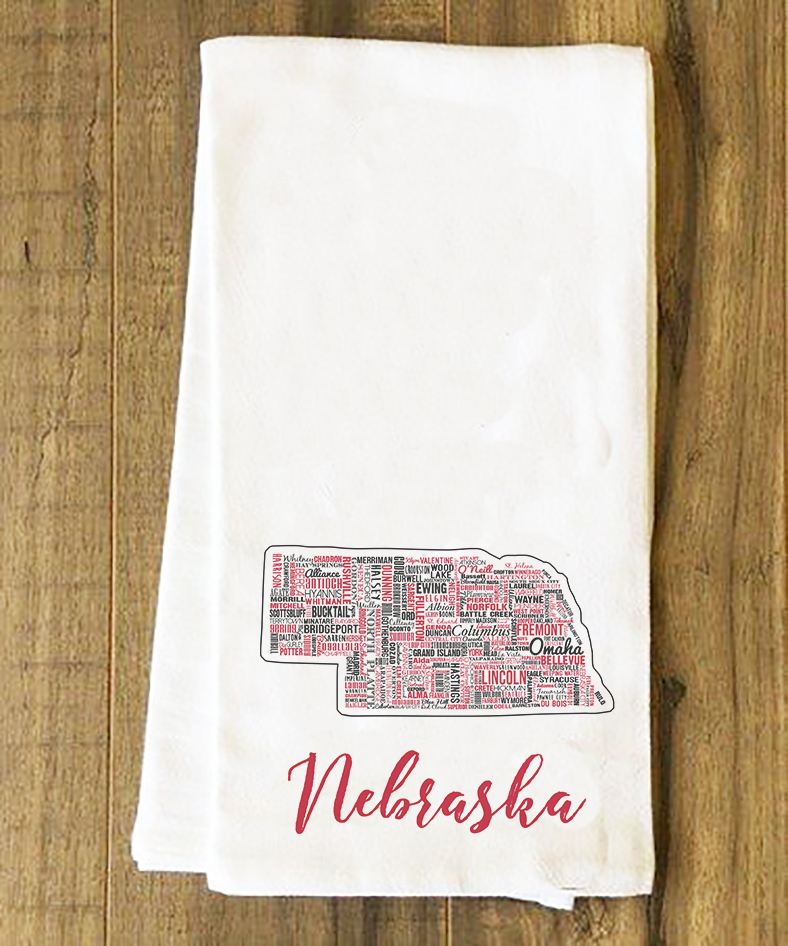 Show off your state pride with these tea towels! This tea towel features the names of cities in Nebraska. These 28" x 29" flour sack towels are 100% cotton, making them lint free, highly absorbent, quick drying, shrink resistant and extremely versatile. They're excellent for wiping up water, drying dishes, and lining baskets full of cookies, and much more. All towels are machine washable, bleed-resistant, and printed in Steubenville, OH.