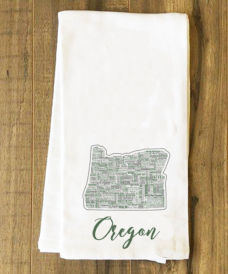 Show off your state pride with these tea towels! This tea towel features the names of cities in Oregon. These 28" x 29" flour sack towels are 100% cotton, making them lint free, highly absorbent, quick drying, shrink resistant and extremely versatile. They're excellent for wiping up water, drying dishes, and lining baskets full of cookies, and much more. All towels are machine washable, bleed-resistant, and printed in Steubenville, OH.