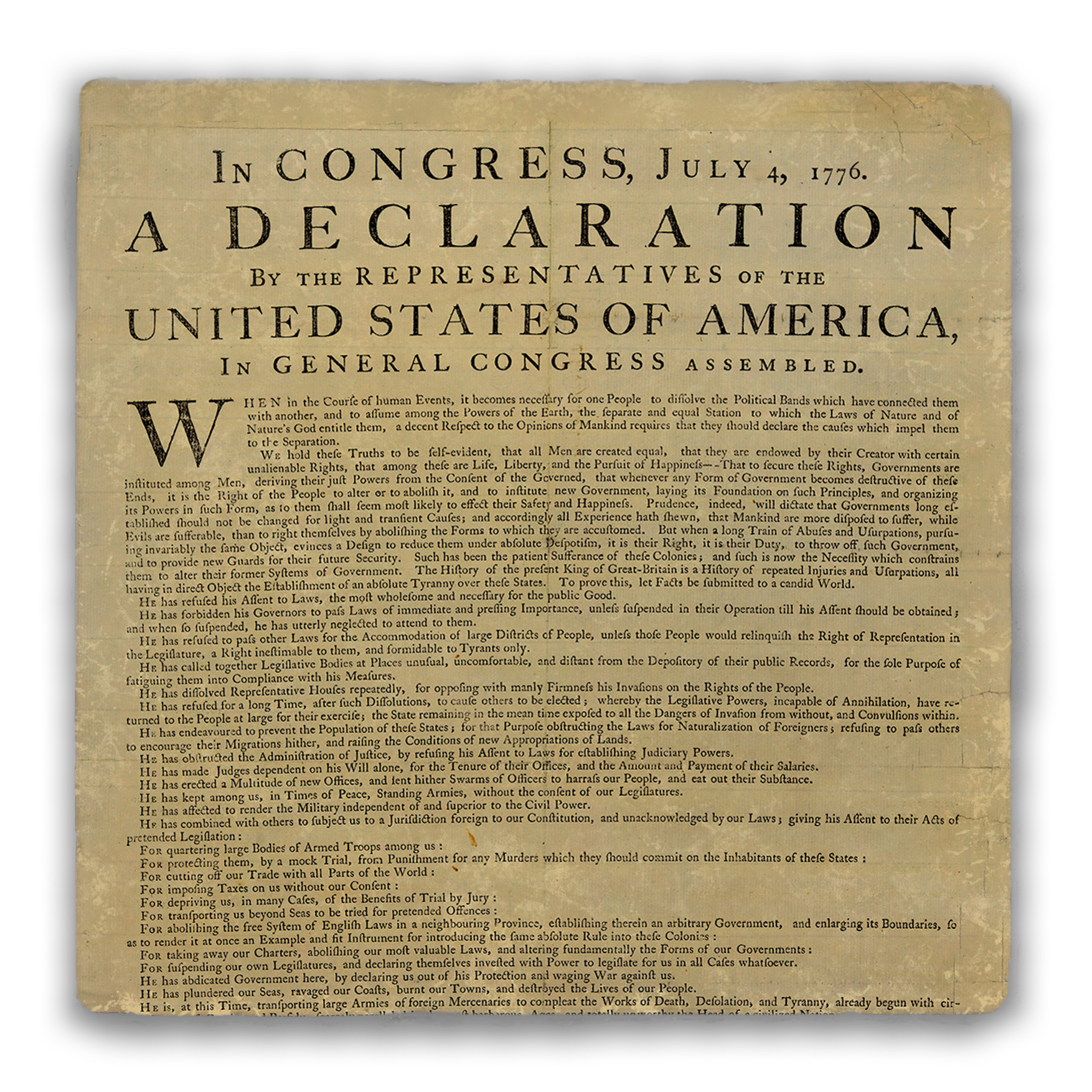 This tumbled stone coaster features the first part of the Declaration of Independence. Save your counter from spills and stains with these wine-themed coasters, or buy some as a gift for a friend! Each coaster is 4 in. x 4 in. and stands 1/2 in. high. As these are cut from real rock, the white flecks and edging on each one will be unique. They are easy to clean, and come with a cork bottom to prevent slipping, and heat transfer. You can buy them in singles or packs of 4. ( COAST2-AM175 ) The AMERICA 250® word mark and logo are trademarks of the U.S. Semiquincentennial Commission and are used by Nelson Enterprises under license.