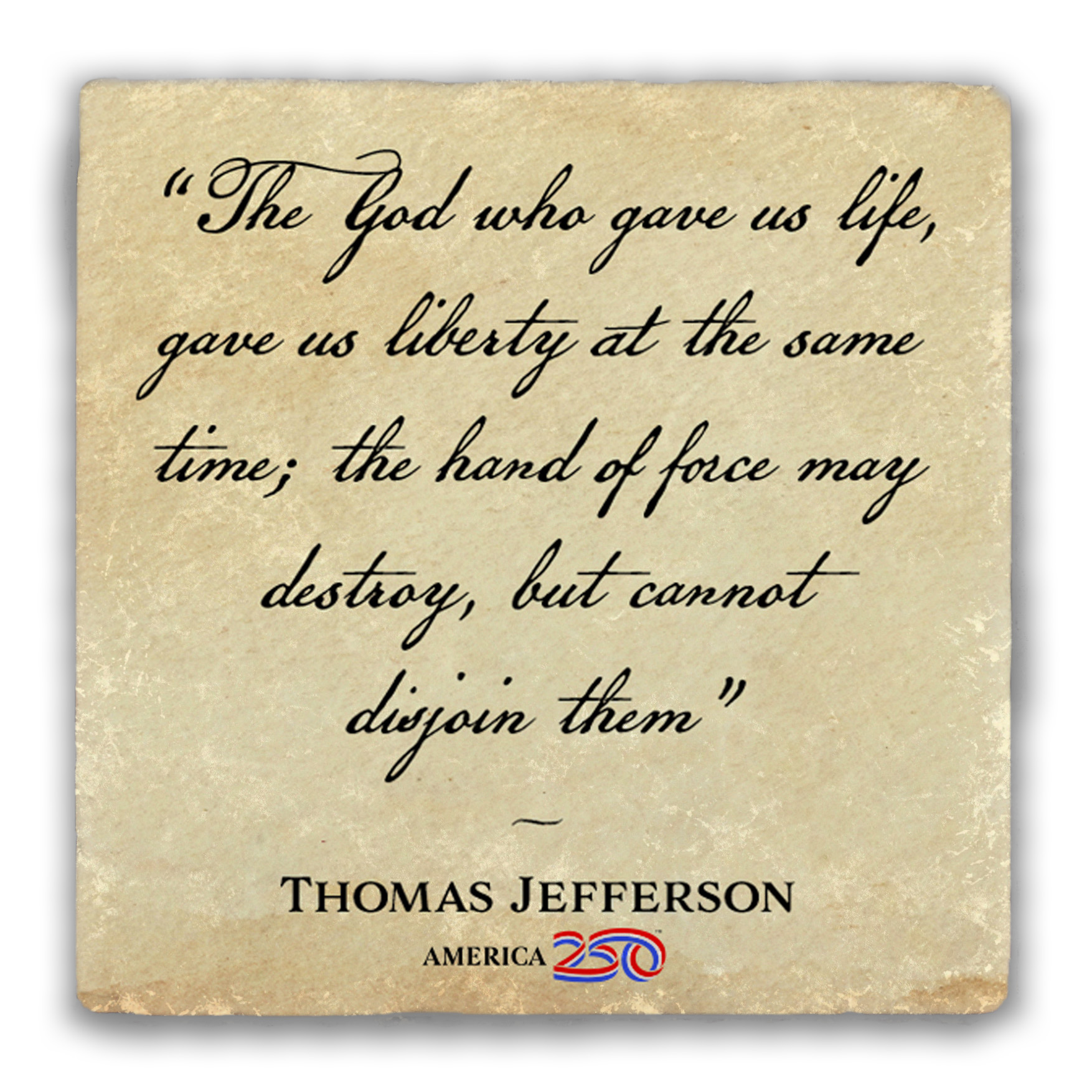 This tumbled stone coaster features the quote from Thomas Jefferson: "The God who gave us life, gave us liberty at the same time; the hand of force may destroy, but cannot disjoin them". Save your counter from spills and stains with these patriotic-themed coasters, or buy some as a gift for a friend! Each coaster is 4 in. x 4 in. and stands 1/2 in. high. As these are cut from real rock, the white flecks and edging on each one will be unique. They are easy to clean, and come with a cork bottom to prevent slipping, and heat transfer. You can buy them in singles or packs of 4. ( COAST2-AM63 ) The AMERICA 250® word mark and logo are trademarks of the U.S. Semiquincentennial Commission and are used by Nelson Enterprises under license.