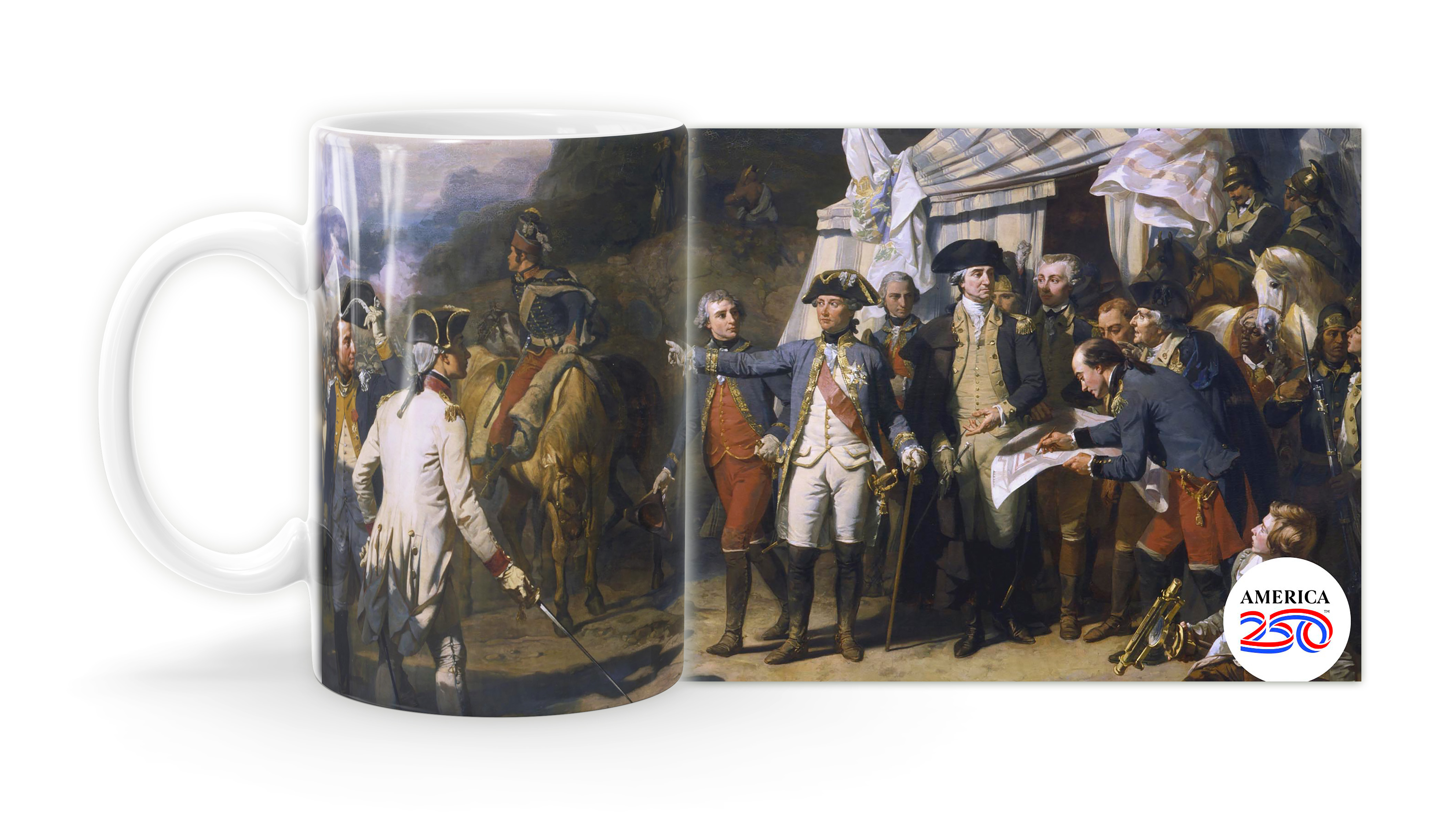 Enjoy your coffee, tea, and hot cocoa in this unique ceramic mug. This 15 oz. high quality coffee mug imprinted in our shops makes a great gift for any event or occasion! This mug features the Siege of Yorktown painting.  ( MUG15X-AM221 ) The AMERICA 250® word mark and logo are trademarks of the U.S. Semiquincentennial Commission and are used by Nelson Enterprises under license.