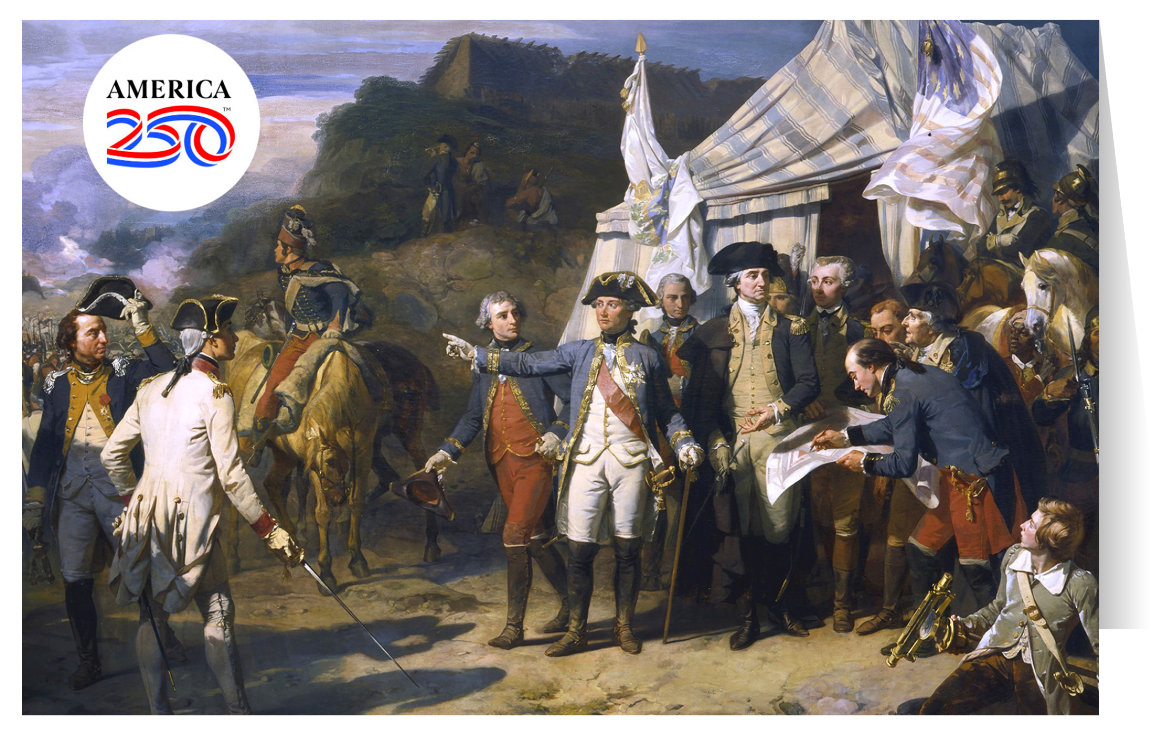 Send thanks, congratulations, greetings, and more to friends and family with these Patriotic Note Cards! The front features the painting "The Siege of Yorktown" by August Couder. The inside is blank. Printed on heavy cardstock, this 4.25"x5.5" card comes with envelopes, and can be bought individually or in bundles of 6.  ( STCA-AM221 ) The AMERICA 250® word mark and logo are trademarks of the U.S. Semiquincentennial Commission and are used by Nelson Enterprises under license.