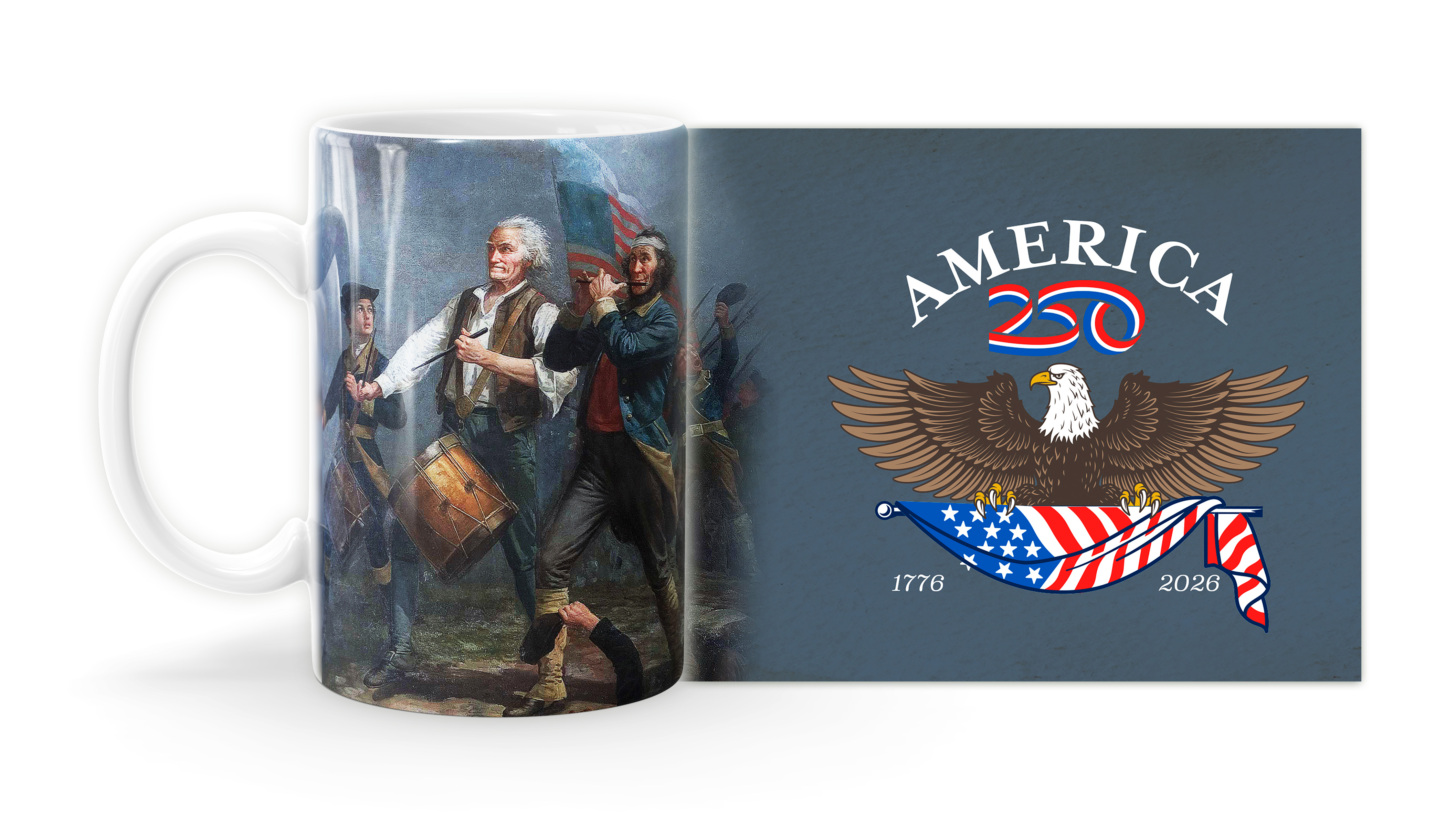 Enjoy your coffee, tea, and hot cocoa in this unique ceramic mug. This 15 oz. high quality coffee mug imprinted in our shops makes a great gift for any event or occasion! This mug features the The Spirit of '76 painting with the American 250 bald eagle.  ( MUG15X-AM173-250A ) The AMERICA 250® word mark and logo are trademarks of the U.S. Semiquincentennial Commission and are used by Nelson Enterprises under license.