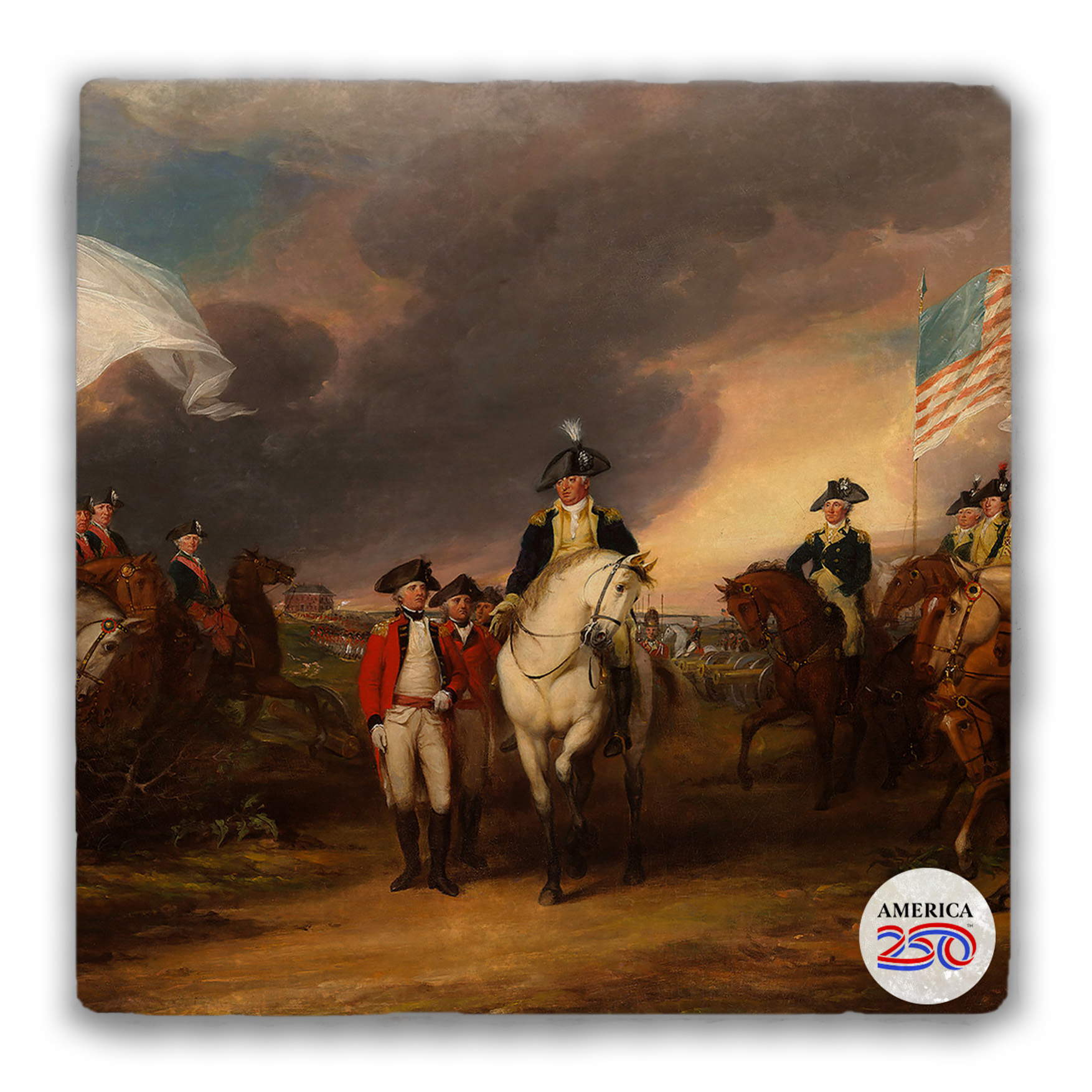 This tumbled stone coaster features the painting "The Surrender of Lord Cornwallis" by John Trumbull. Save your counter from spills and stains with these patriotic coasters, or buy some as a gift for a friend! Each coaster is 4 in. x 4 in. and stands 1/2 in. high. As these are cut from real rock, the white flecks and edging on each one will be unique. They are easy to clean, and come with a cork bottom to prevent slipping, and heat transfer. You can buy them in singles or packs of 4. ( COAST2-AM193 ) The AMERICA 250® word mark and logo are trademarks of the U.S. Semiquincentennial Commission and are used by Nelson Enterprises under license.