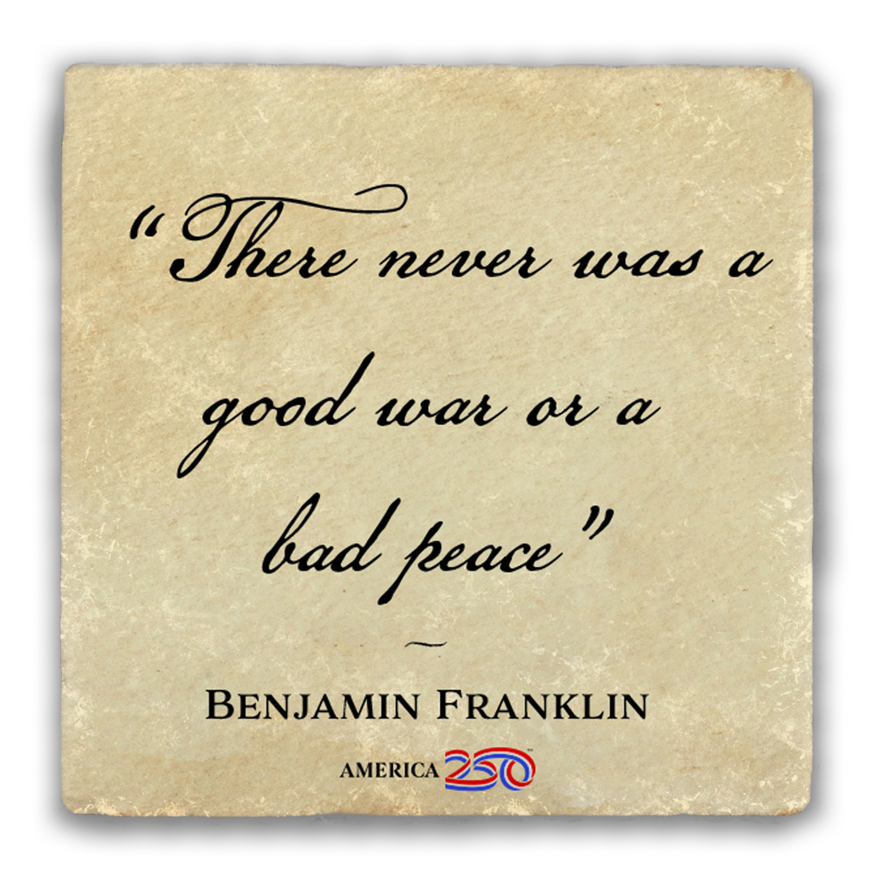 This tumbled stone coaster features the quote from Benjamin Franklin: "There never was a good war or a bad peace". Save your counter from spills and stains with these patriotic-themed coasters, or buy some as a gift for a friend! Each coaster is 4 in. x 4 in. and stands 1/2 in. high. As these are cut from real rock, the white flecks and edging on each one will be unique. They are easy to clean, and come with a cork bottom to prevent slipping, and heat transfer. You can buy them in singles or packs of 4. ( COAST2-AM72 ) The AMERICA 250® word mark and logo are trademarks of the U.S. Semiquincentennial Commission and are used by Nelson Enterprises under license.