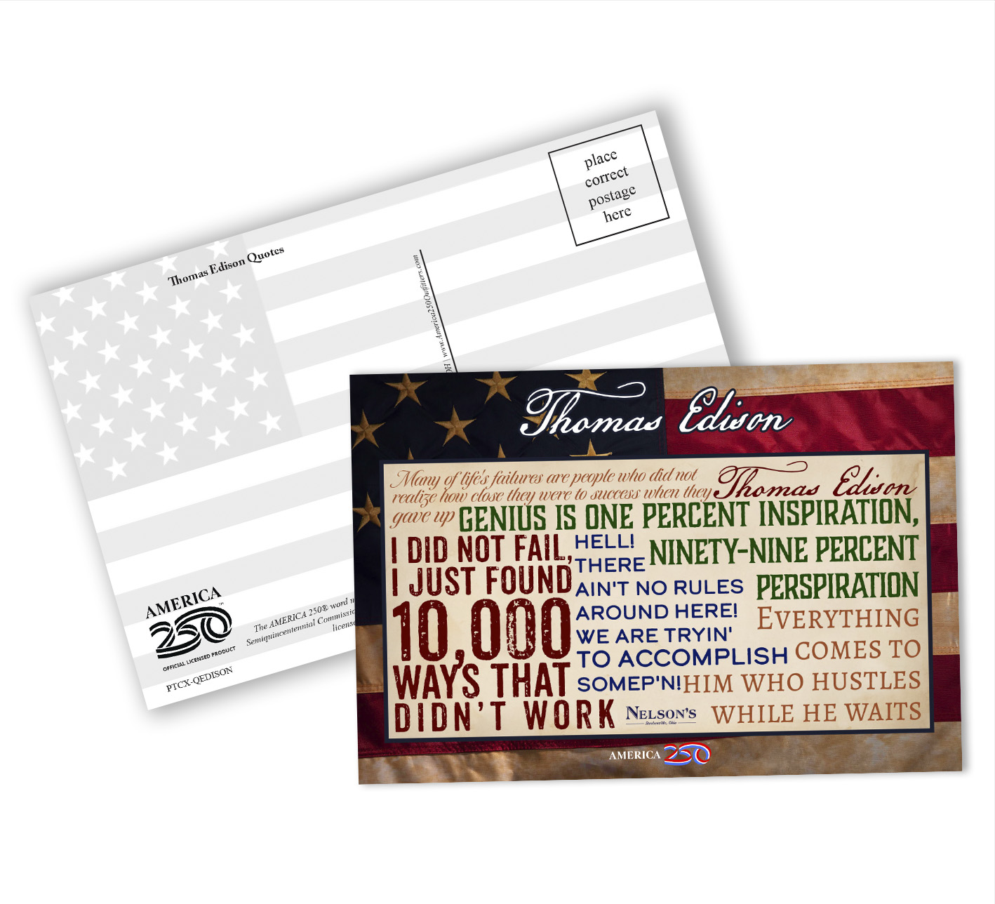 Send a message to friends and family with these Patriotic greeting cards! The front features various quotes from Thomas Edison. These postcards can be bought as singles, or in a bundle of a dozen. ( PTC-QEDISON ) The AMERICA 250® word mark and logo are trademarks of the U.S. Semiquincentennial Commission and are used by Nelson Enterprises under license.