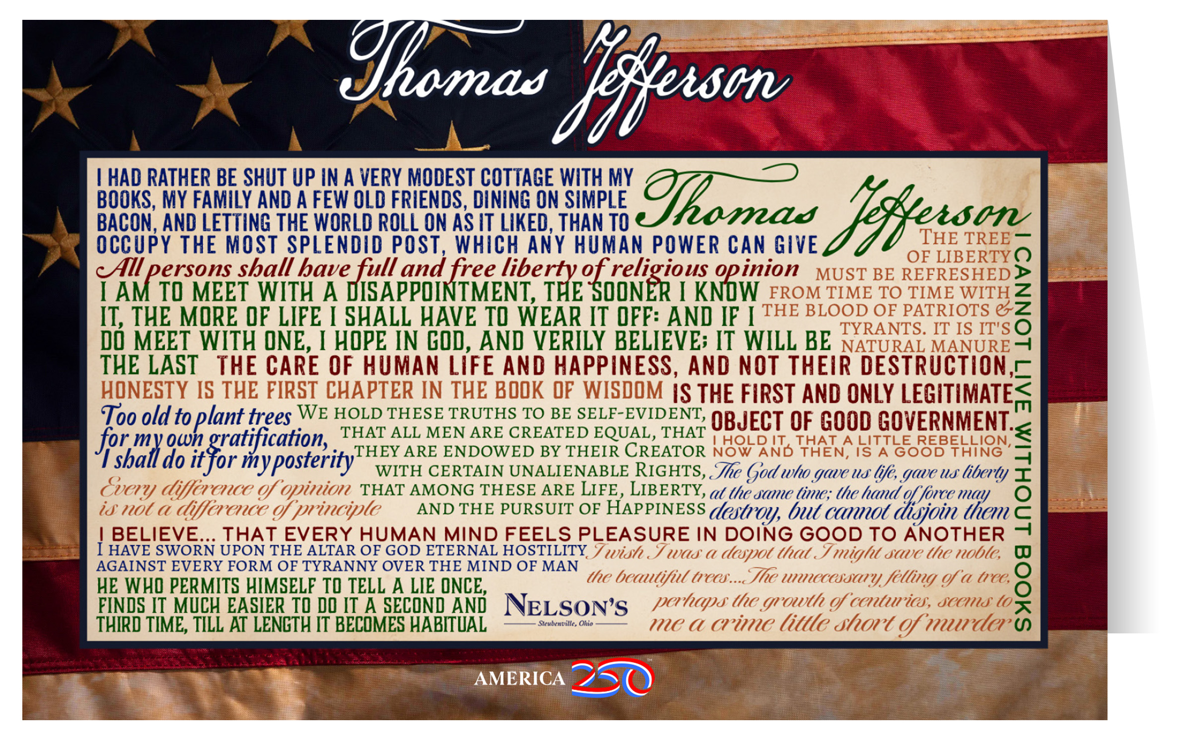Send thanks, congratulations, greetings, and more to friends and family with these Patriotic greeting cards! The front features various quotes from Thomas Jefferson. The inside is blank. Printed on heavy cardstock, this 4.25"x5.5" card comes with envelopes, and can be bought individually or in bundles of 6.  ( STC-QJEFFERSON ) The AMERICA 250® word mark and logo are trademarks of the U.S. Semiquincentennial Commission and are used by Nelson Enterprises under license.