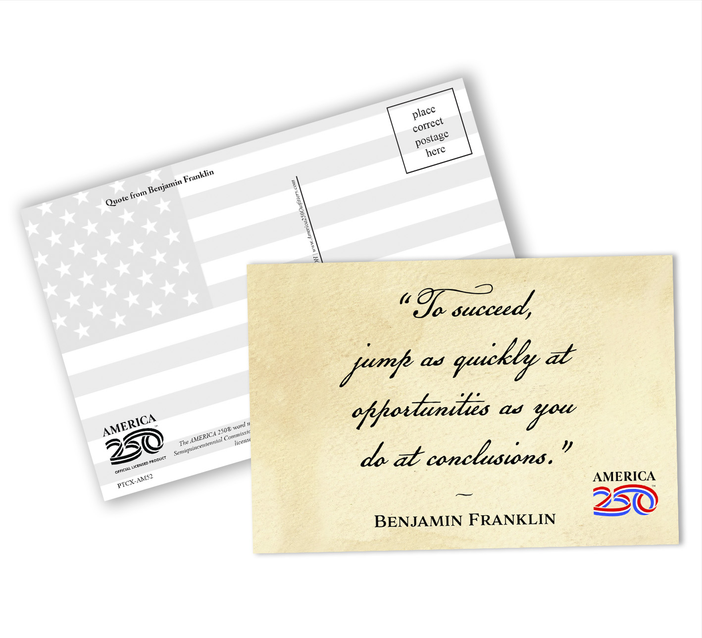 Send a message to friends and family with these Patriotic Postcards! The front features the quote from Benjamin Franklin: "To succeed, jumps as quickly at opportunities as you do conclusions". These postcards can be bought as singles, or in a bundle of a dozen. ( PTC-AM52 ) The AMERICA 250® word mark and logo are trademarks of the U.S. Semiquincentennial Commission and are used by Nelson Enterprises under license.