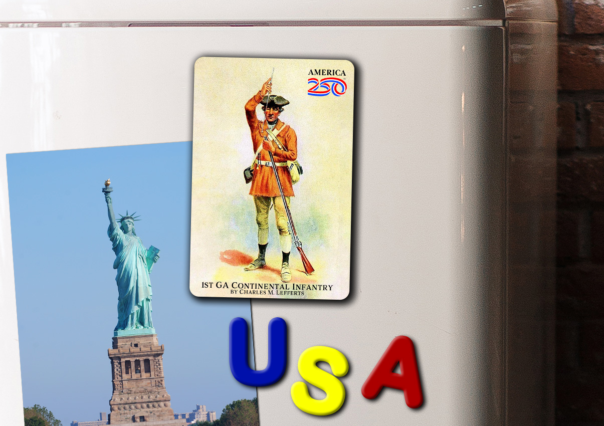 Show off your patriotism on your refrigerator, filing cabinet, or workspace with this glossy, durable magnet. This Magnet features the painting “1st GA Continental Infantry”by Charles M. Lefferts.