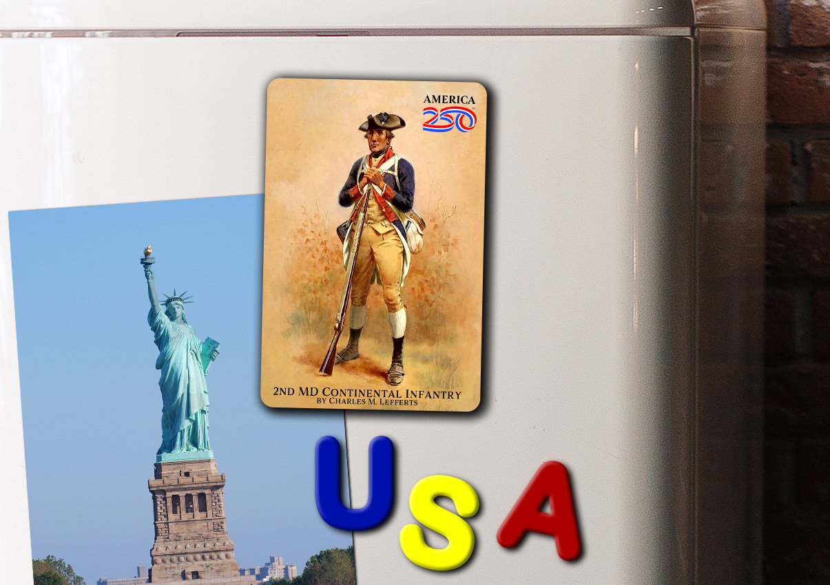 Show off your patriotism on your refrigerator, filing cabinet, or workspace with this glossy, durable magnet. This Magnet features the painting “2nd MD Continental Infantry”by Charles M. Lefferts.