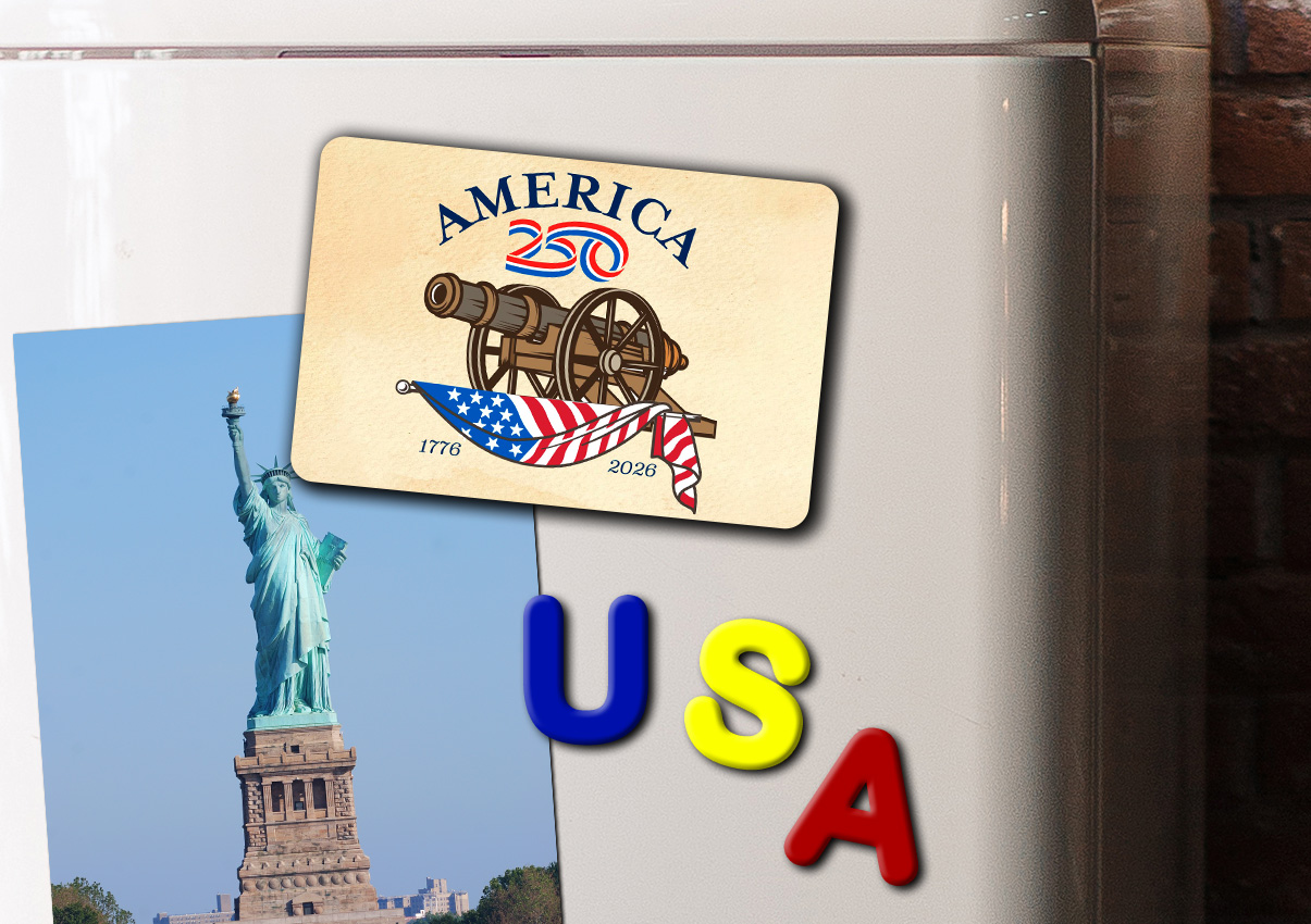 Show off your patriotism on your refrigerator, filing cabinet, or workspace with this glossy, durable magnet. Celebrate America’s Semiquincentennial Anniversary (America’s 250th Birthday) with this commemorative design featuring the words America 250 and the American Flag draped beneath a cannon - a symbol of American freedom and the ability to defend against threats..