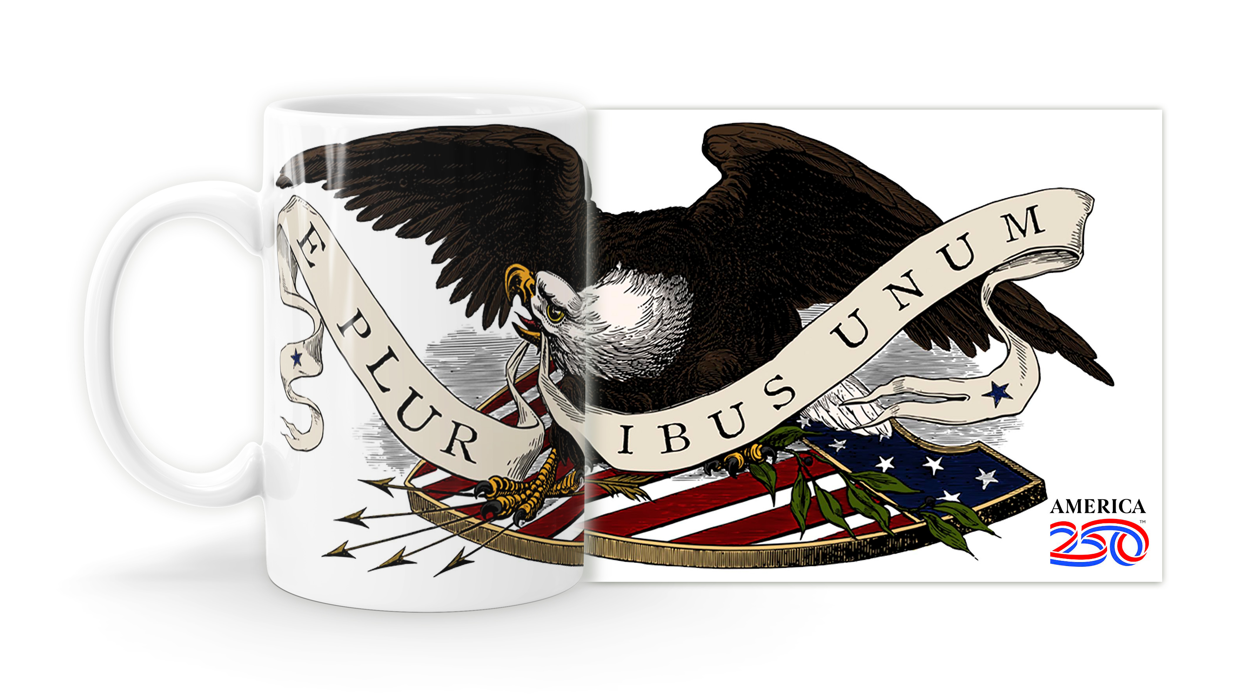 Enjoy your coffee, tea, and hot cocoa in this unique ceramic mug. This 15 oz. high quality coffee mug imprinted in our shops makes a great gift for any event or occasion! This mug features a bald eagle with a shield and a banner that says "E Pluribus Unum."  ( MUG15X-AM168B ) The AMERICA 250® word mark and logo are trademarks of the U.S. Semiquincentennial Commission and are used by Nelson Enterprises under license.