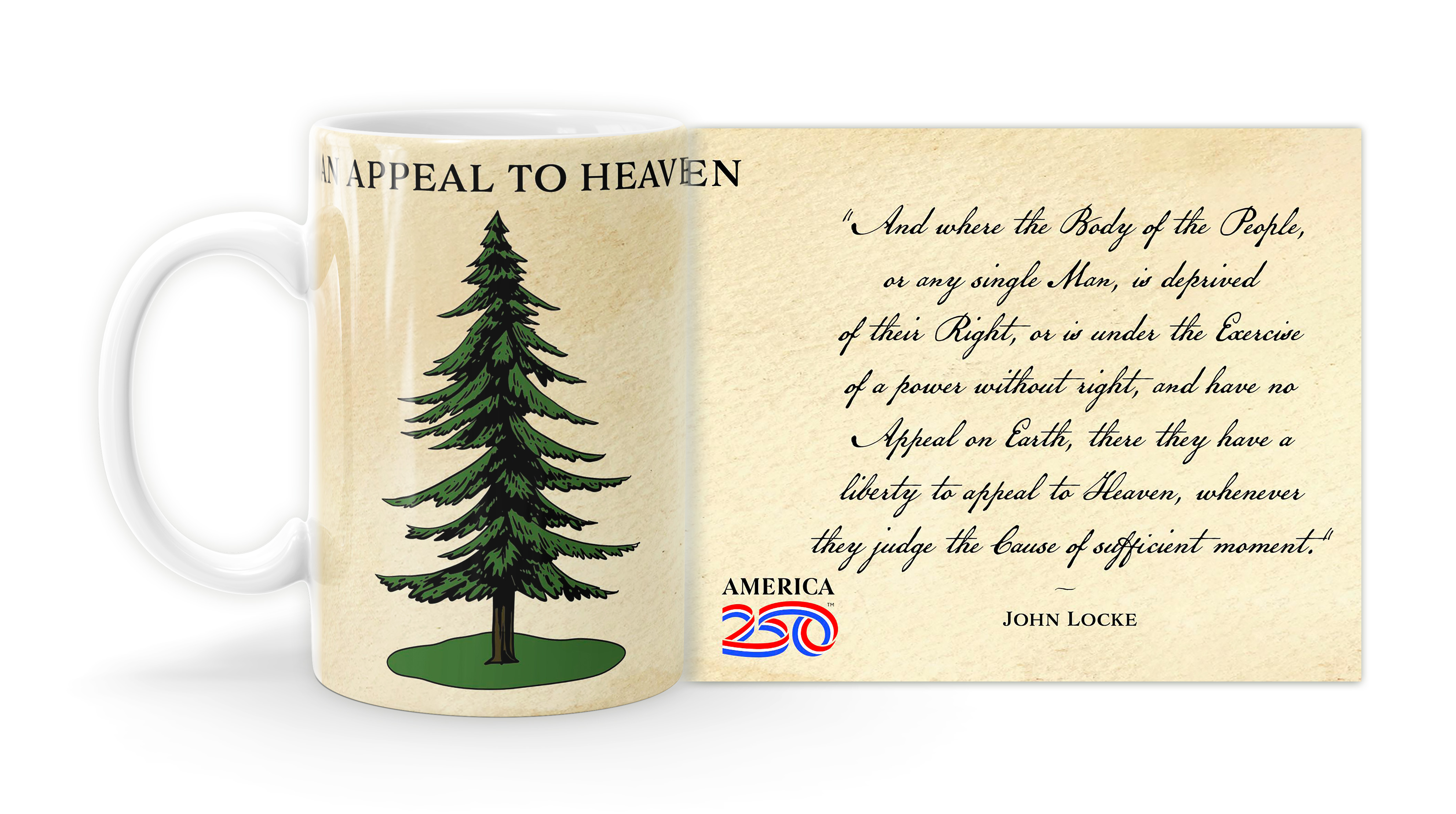 Enjoy your coffee, tea, and hot cocoa in this unique ceramic mug. This 15 oz. high quality coffee mug imprinted in our shops makes a great gift for any event or occasion! This mug features the Appeal to Heaven Flag.  ( MUG15X-AM240C ) The AMERICA 250® word mark and logo are trademarks of the U.S. Semiquincentennial Commission and are used by Nelson Enterprises under license.