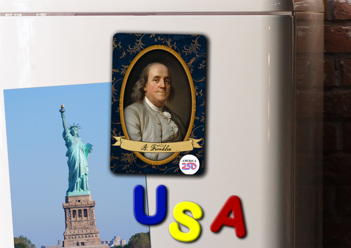 Show off your patriotism on your refrigerator, filing cabinet, or workspace with this glossy, durable magnet. This Magnet features a painting of Benjamin Franklin.