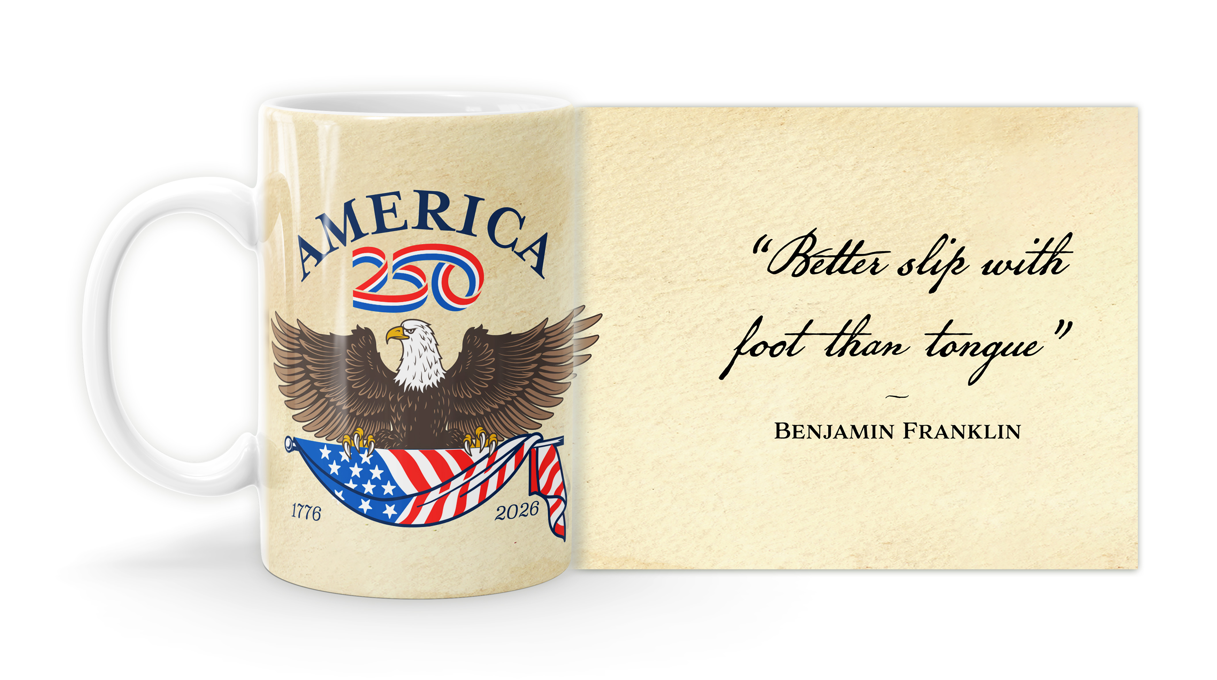 Enjoy your coffee, tea, and hot cocoa in this unique ceramic mug. This 15 oz. high quality coffee mug imprinted in our shops makes a great gift for any event or occasion! This mug features the Benjamin Franklin Quote "Better slip with foot than tongue” with America250 Logo ( MUG15X-AM250A-41 ) The AMERICA 250® word mark and logo are trademarks of the U.S. Semiquincentennial Commission and are used by Nelson Enterprises under license.
