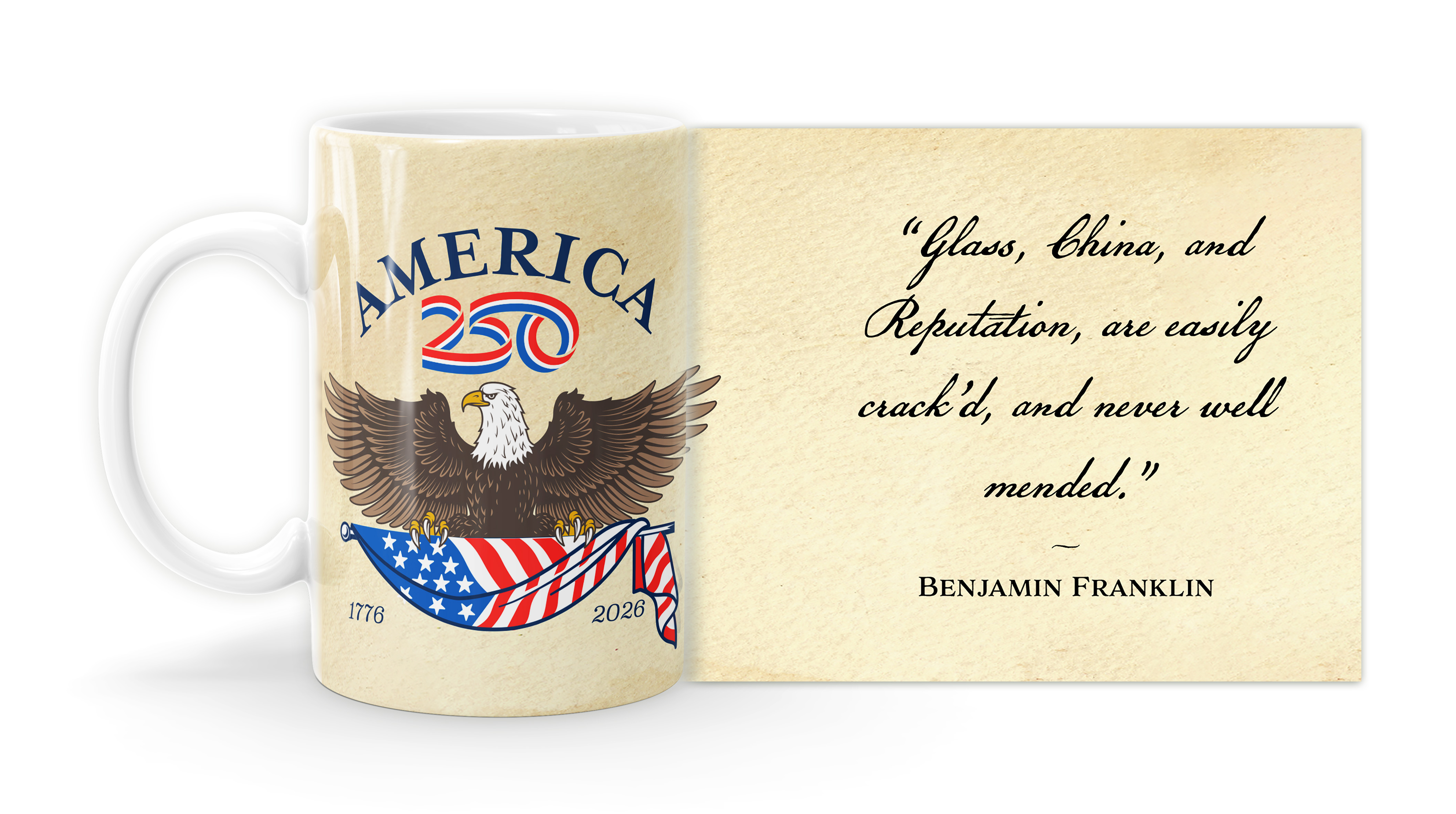 Enjoy your coffee, tea, and hot cocoa in this unique ceramic mug. This 15 oz. high quality coffee mug imprinted in our shops makes a great gift for any event or occasion! This mug features the Benjamin Franklin Quote "Glass, China, and Reputation, are easily crack’d, and never well mended. ” with America250 Logo ( MUG15X-AM250A-44 ) The AMERICA 250® word mark and logo are trademarks of the U.S. Semiquincentennial Commission and are used by Nelson Enterprises under license.