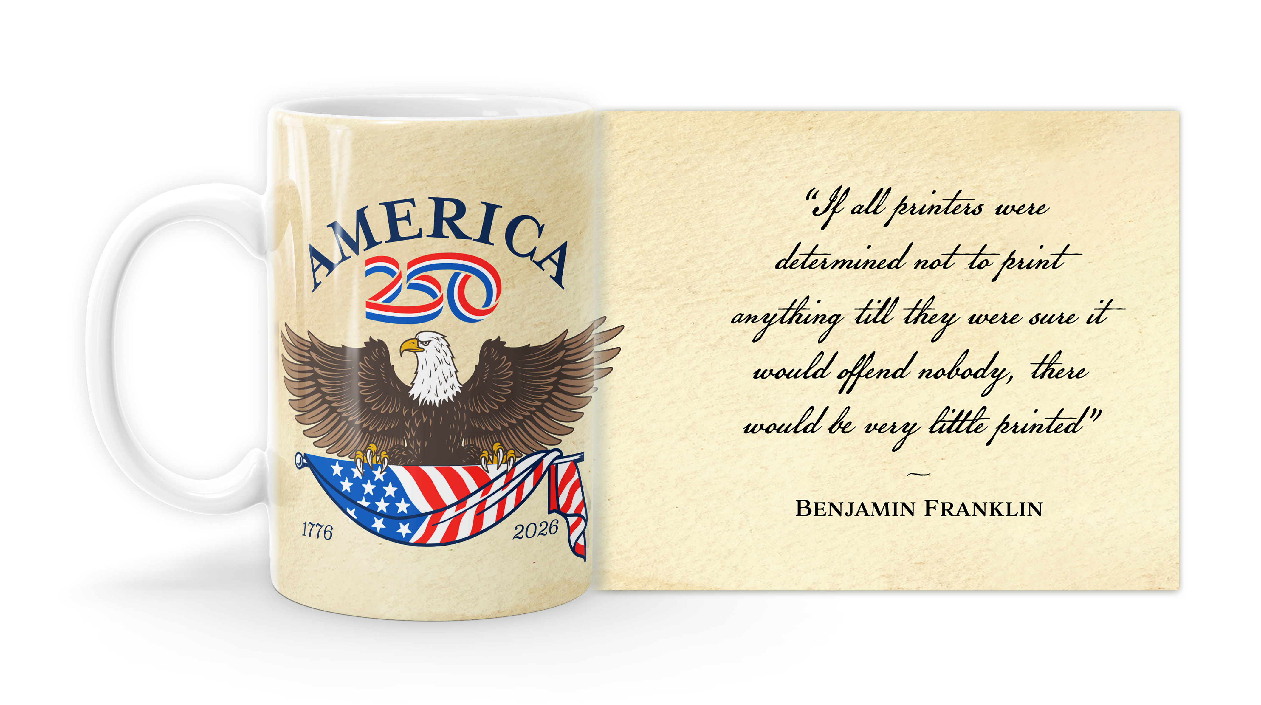 Enjoy your coffee, tea, and hot cocoa in this unique ceramic mug. This 15 oz. high quality coffee mug imprinted in our shops makes a great gift for any event or occasion! This mug features the Benjamin Franklin Quote "If all printers were determined not to print anything till they were sure it would offend nobody, there would be very little printed” with America250 Logo