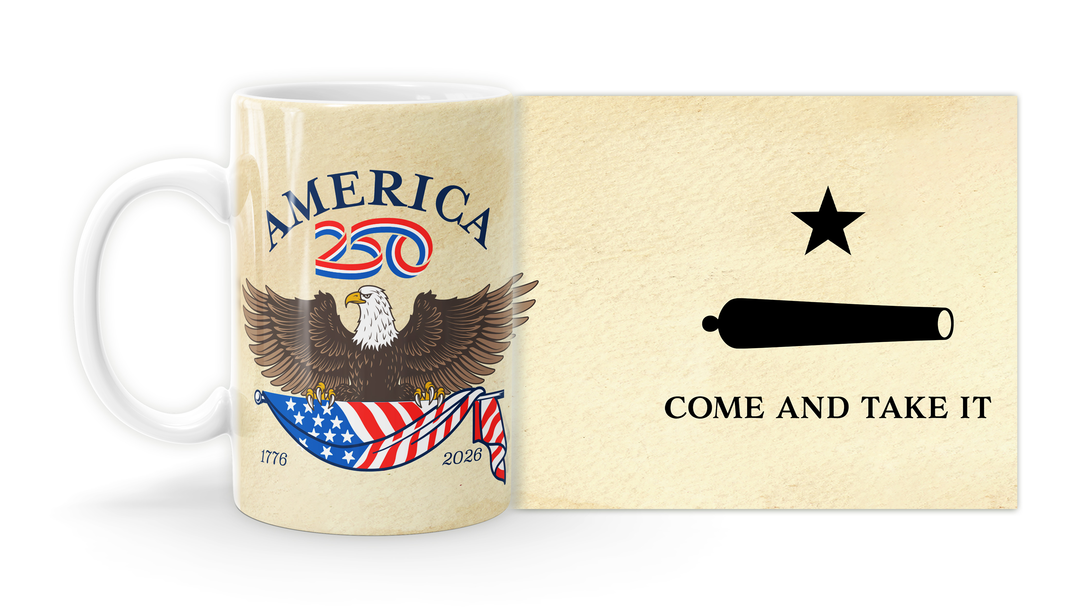 Enjoy your coffee, tea, and hot cocoa in this unique ceramic mug. This 15 oz. high quality coffee mug imprinted in our shops makes a great gift for any event or occasion! This mug features the "Come and Take it" flag with America 250 bald eagle. ( MUG15X-AM261B ) The AMERICA 250® word mark and logo are trademarks of the U.S. Semiquincentennial Commission and are used by Nelson Enterprises under license.