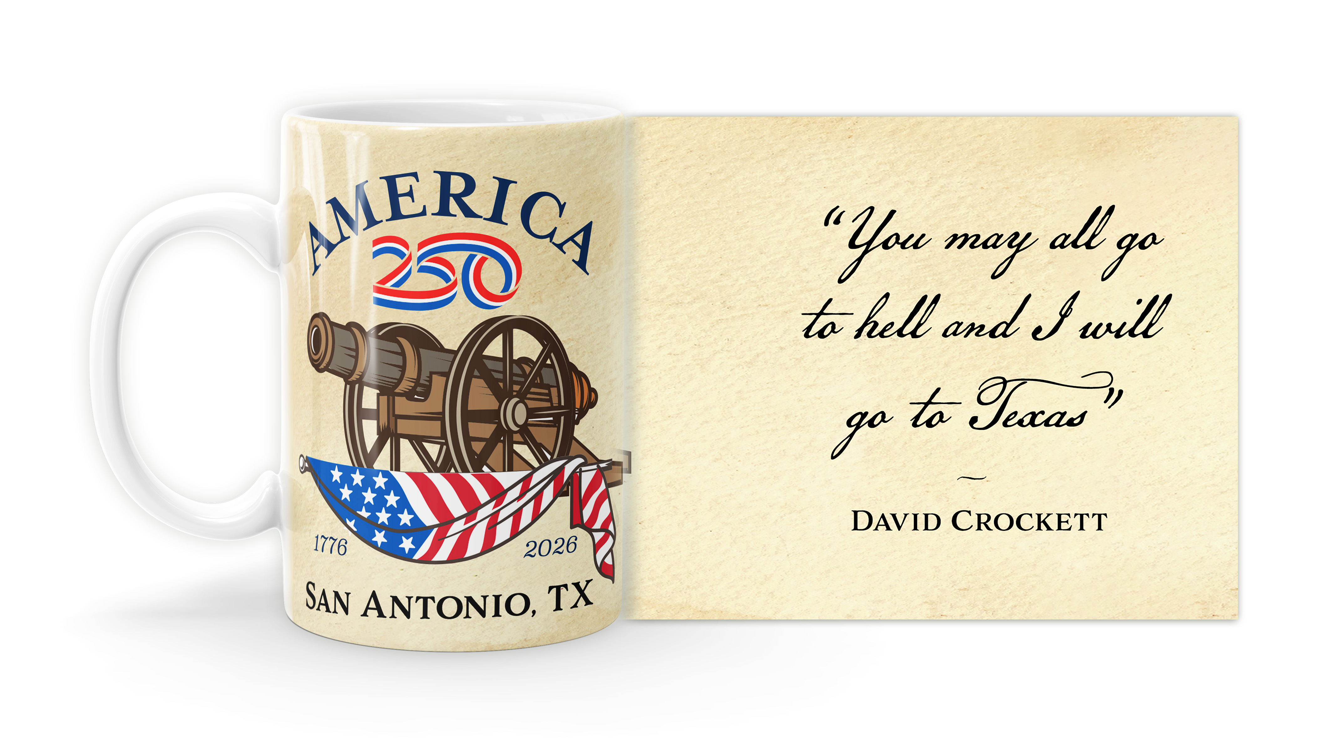 Enjoy your coffee, tea, and hot cocoa in this unique ceramic mug. This 15 oz. high quality coffee mug imprinted in our shops makes a great gift for any event or occasion! Celebrate America’s Semiquincentennial Anniversary (America’s 250th Birthday) The AMERICA 250® word mark and logo are trademarks of the U.S. Semiquincentennial Commission and are used by Nelson Enterprises under license. with this commemorative design featuring the words America 250 and the American Flag draped beneath a cannon - a symbol of American freedom and the ability to defend against threats.  ( MUG15X-AM250A-Custom1 ) The AMERICA 250® word mark and logo are trademarks of the U.S. Semiquincentennial Commission and are used by Nelson Enterprises under license.