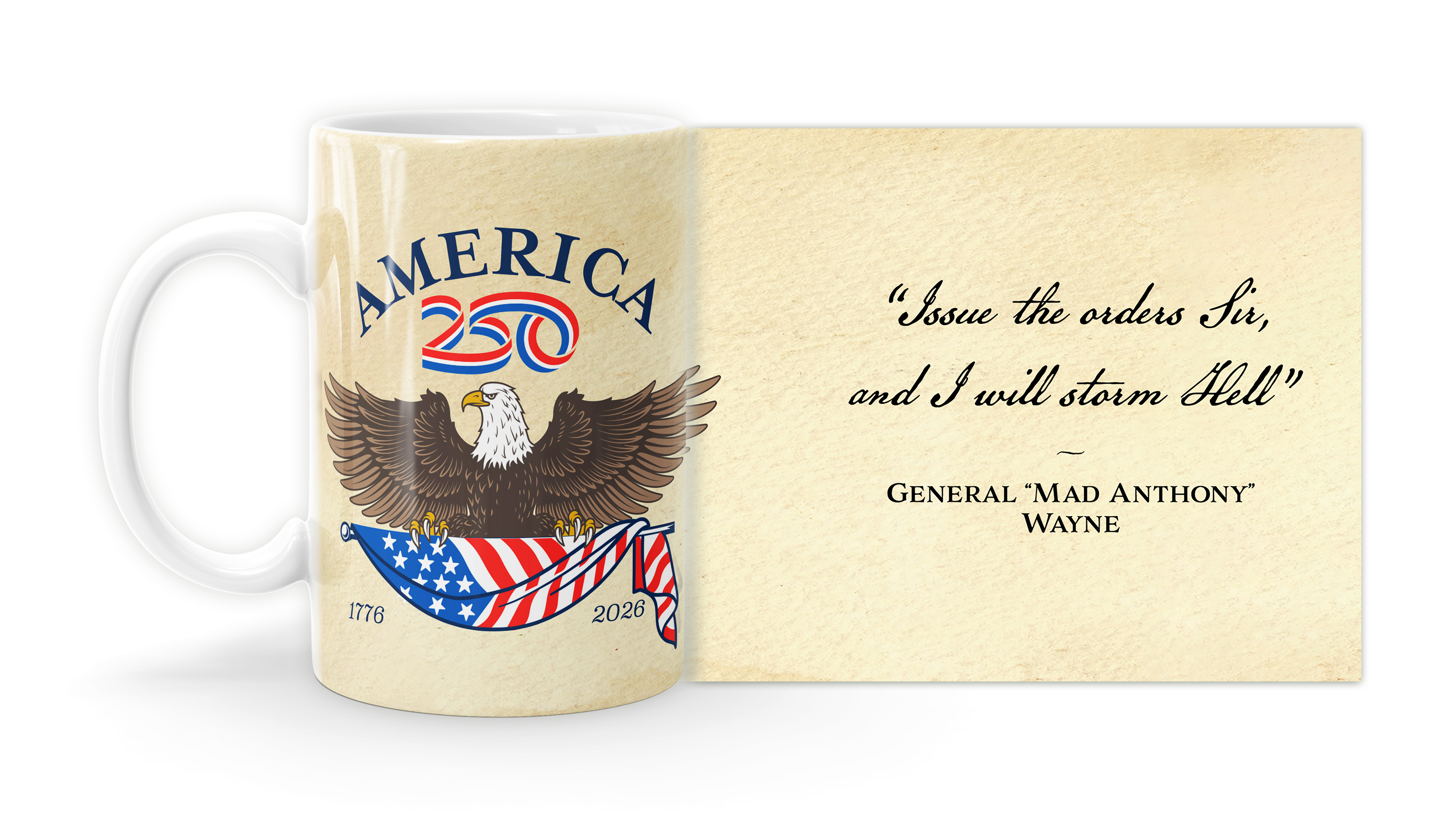 Enjoy your coffee, tea, and hot cocoa in this unique ceramic mug. This 15 oz. high quality coffee mug imprinted in our shops makes a great gift for any event or occasion! This mug features the General “Mad Anthony” WayneQuote "Issue the orders Sir, and I will storm Hell." with America250 Logo