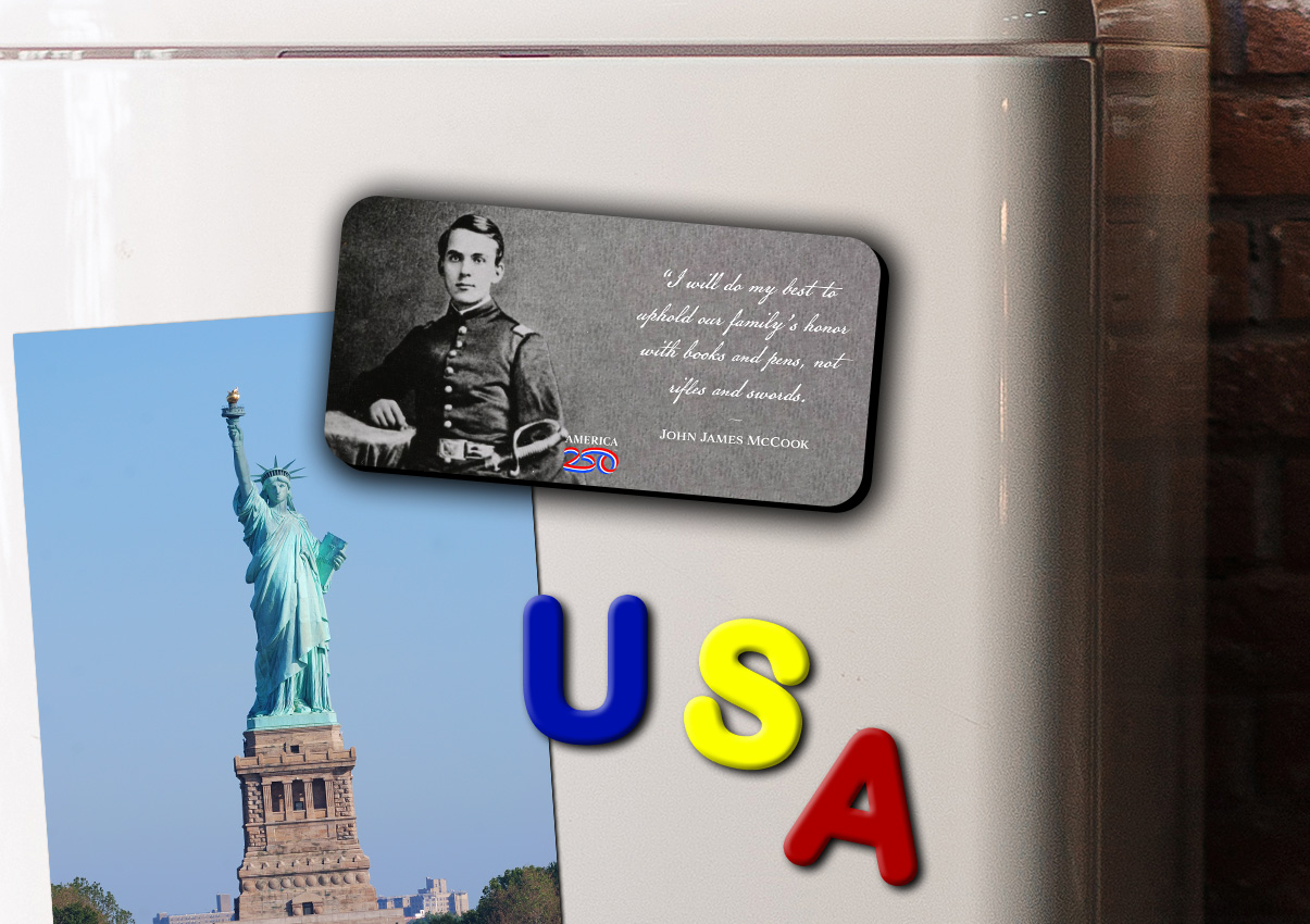 Show off your patriotism on your refrigerator, filing cabinet, or workspace with this glossy, durable magnet. This Magnet features the quote from John James McCook: "I will do my best to uphold our Family's honor with books and pens, not rifles and swords".