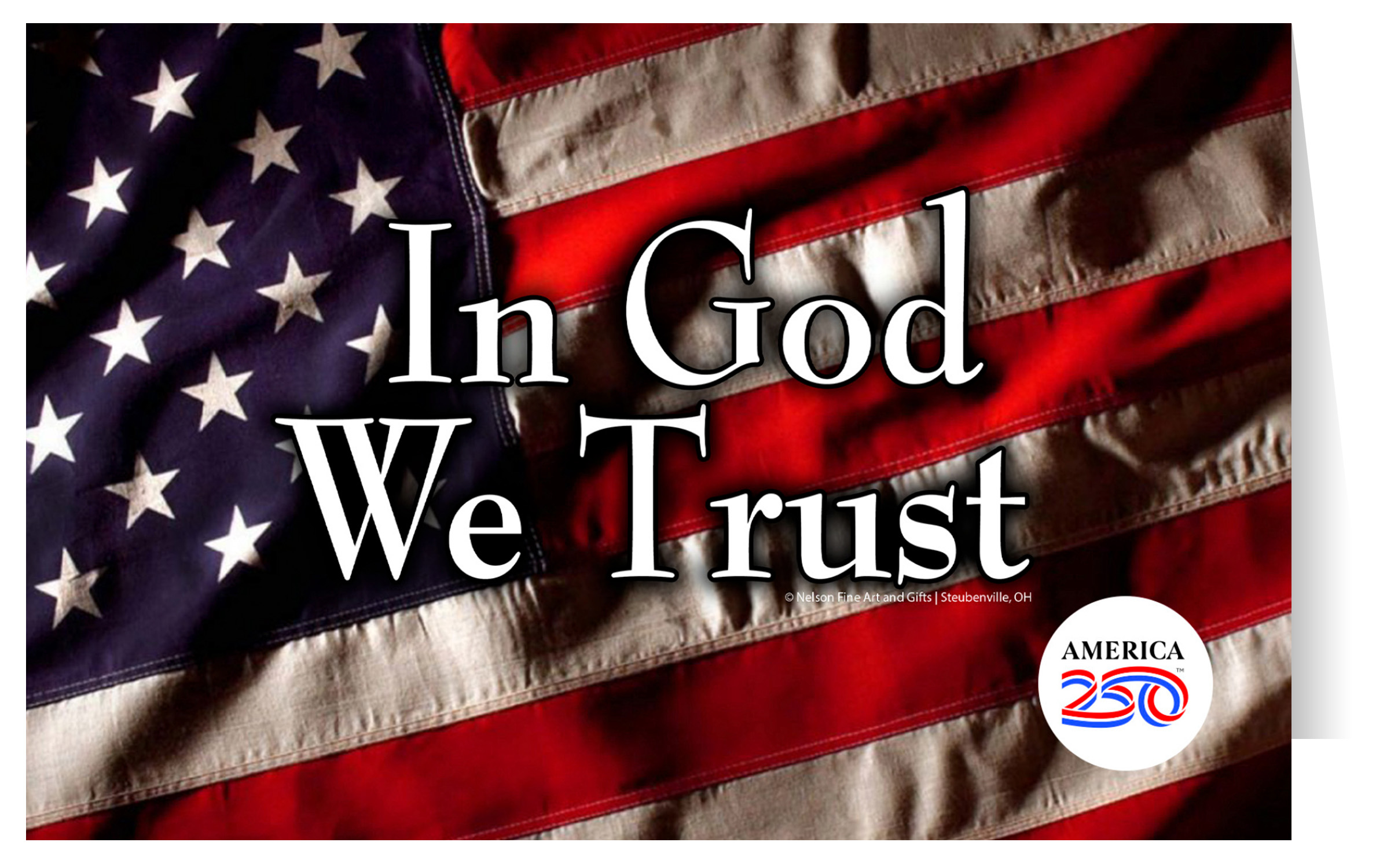 Send thanks, congratulations, greetings, and more to friends and family with these Patriotic Note Cards! The front  features the American flag with text that reads "In God We Trust." The inside is blank. Printed on heavy cardstock, this 4.25"x5.5" card comes with envelopes, and can be bought individually or in bundles of 6.  ( STCA-AM265 ) The AMERICA 250® word mark and logo are trademarks of the U.S. Semiquincentennial Commission and are used by Nelson Enterprises under license.