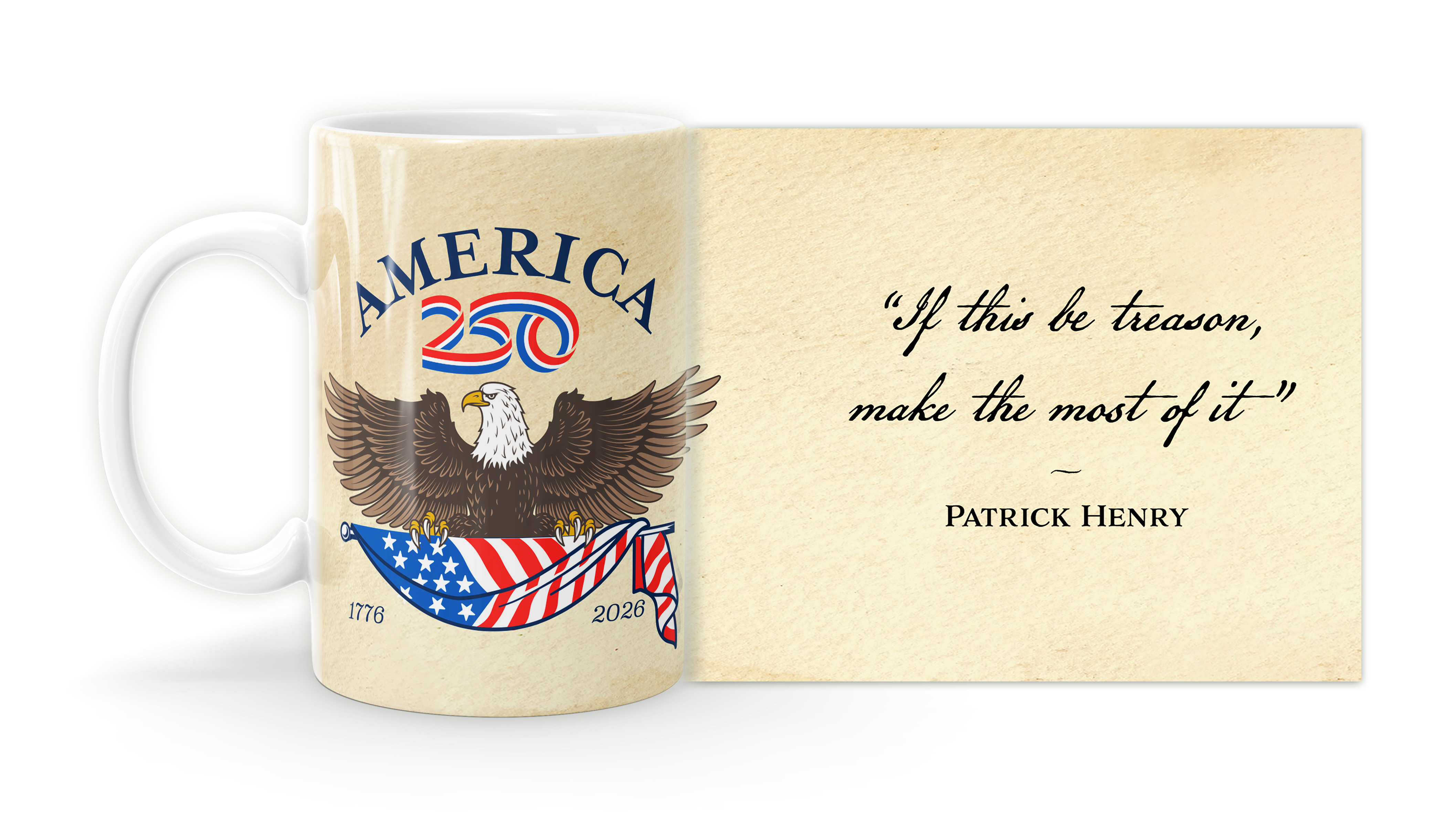 Enjoy your coffee, tea, and hot cocoa in this unique ceramic mug. This 15 oz. high quality coffee mug imprinted in our shops makes a great gift for any event or occasion! This mug features the Patrick Henry Quote “If this be treason, make the most of it” with America250 Logo ( MUG15X-AM250A-20 ) The AMERICA 250® word mark and logo are trademarks of the U.S. Semiquincentennial Commission and are used by Nelson Enterprises under license.