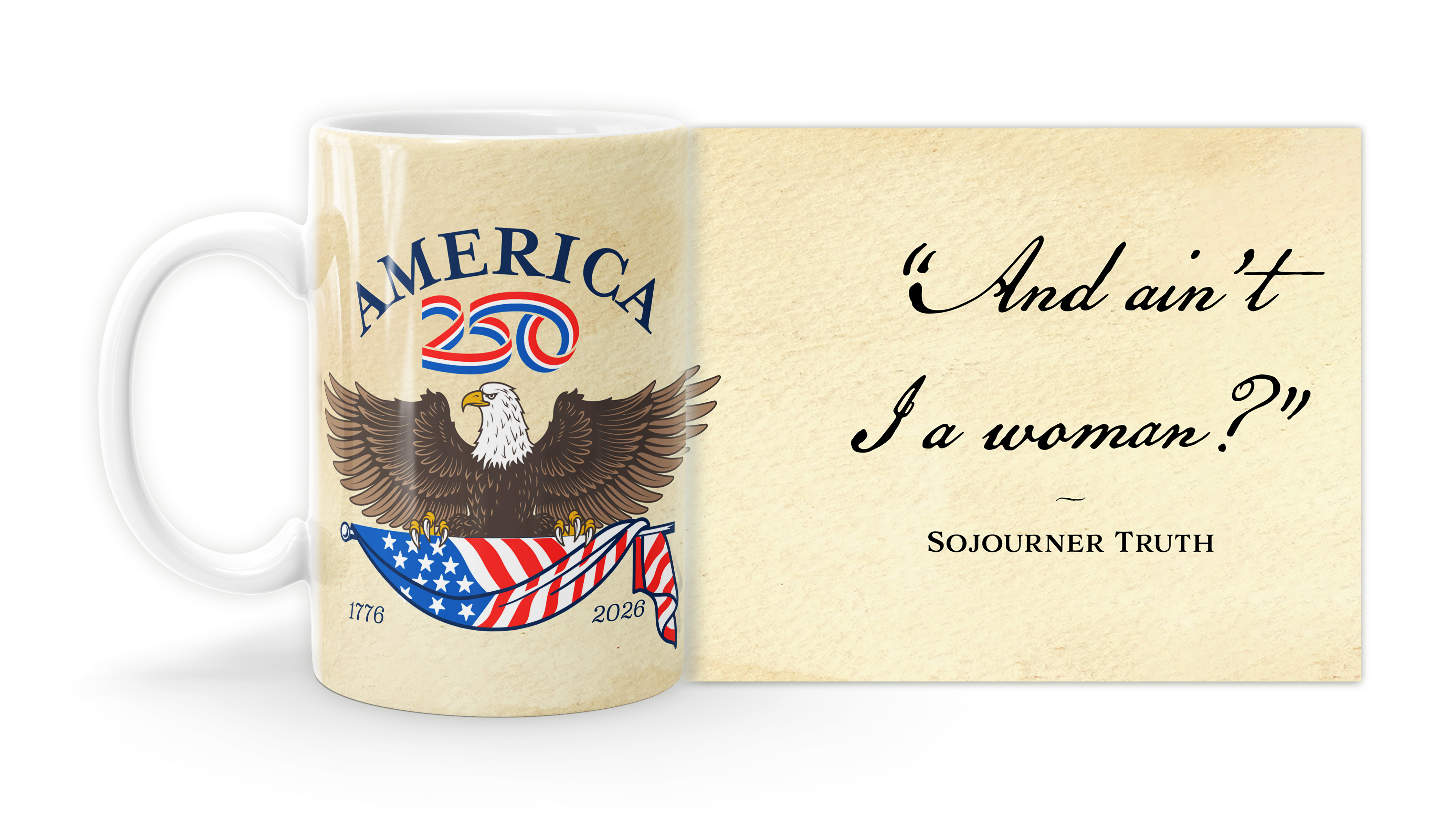 Enjoy your coffee, tea, and hot cocoa in this unique ceramic mug. This 15 oz. high quality coffee mug imprinted in our shops makes a great gift for any event or occasion! This mug features the Sojourner Truth Quote "And ain’t I a woman?" with America250 Logo ( MUG15X-AM250A-85 ) The AMERICA 250® word mark and logo are trademarks of the U.S. Semiquincentennial Commission and are used by Nelson Enterprises under license.