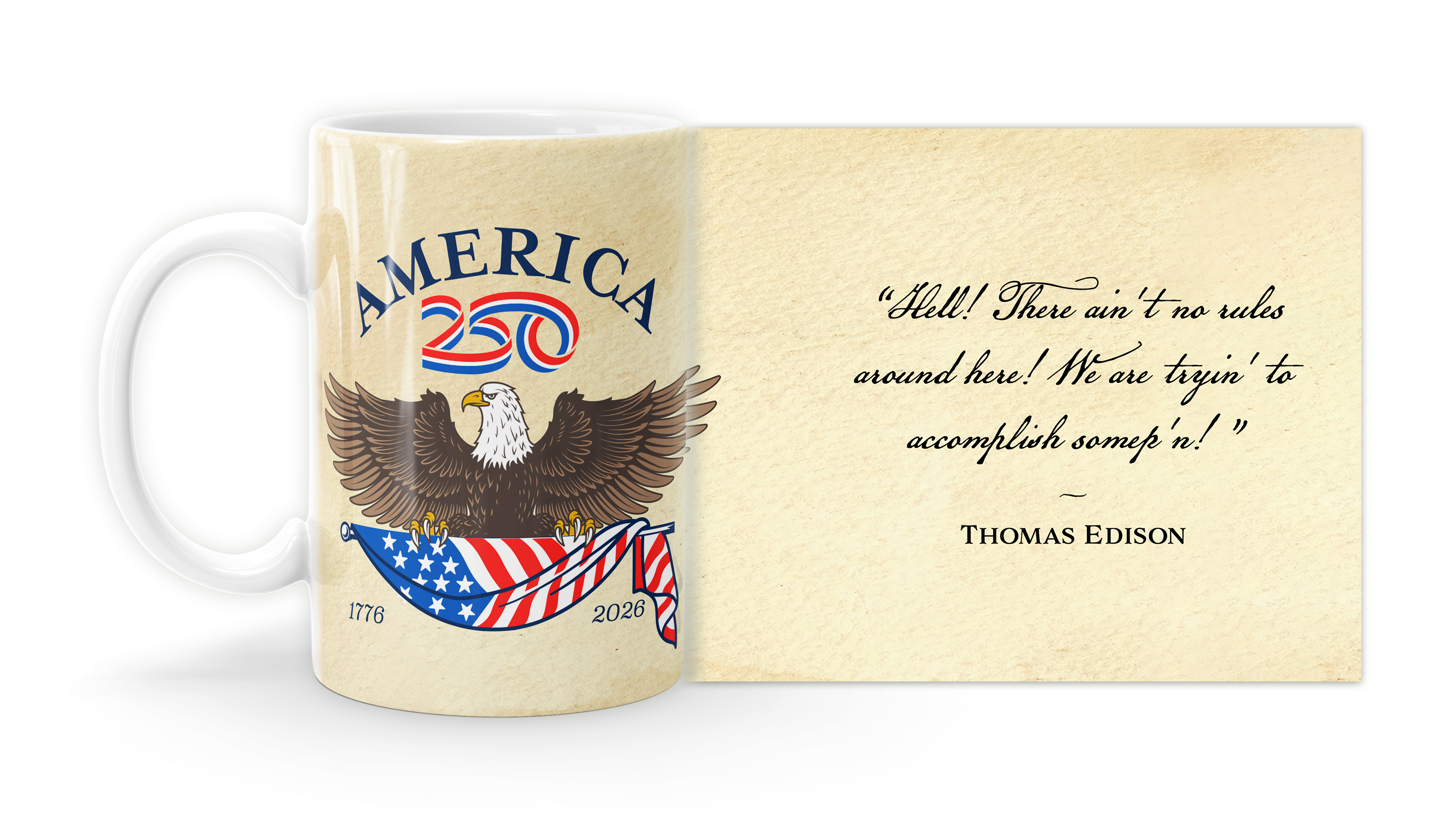 Enjoy your coffee, tea, and hot cocoa in this unique ceramic mug. This 15 oz. high quality coffee mug imprinted in our shops makes a great gift for any event or occasion! This mug features the Thomas Edison Quote "Hell! There ain't no rules around here! We are tryin' to accomplish somep'n! ” with America250 Logo ( MUG15X-AM250A-90 ) The AMERICA 250® word mark and logo are trademarks of the U.S. Semiquincentennial Commission and are used by Nelson Enterprises under license.