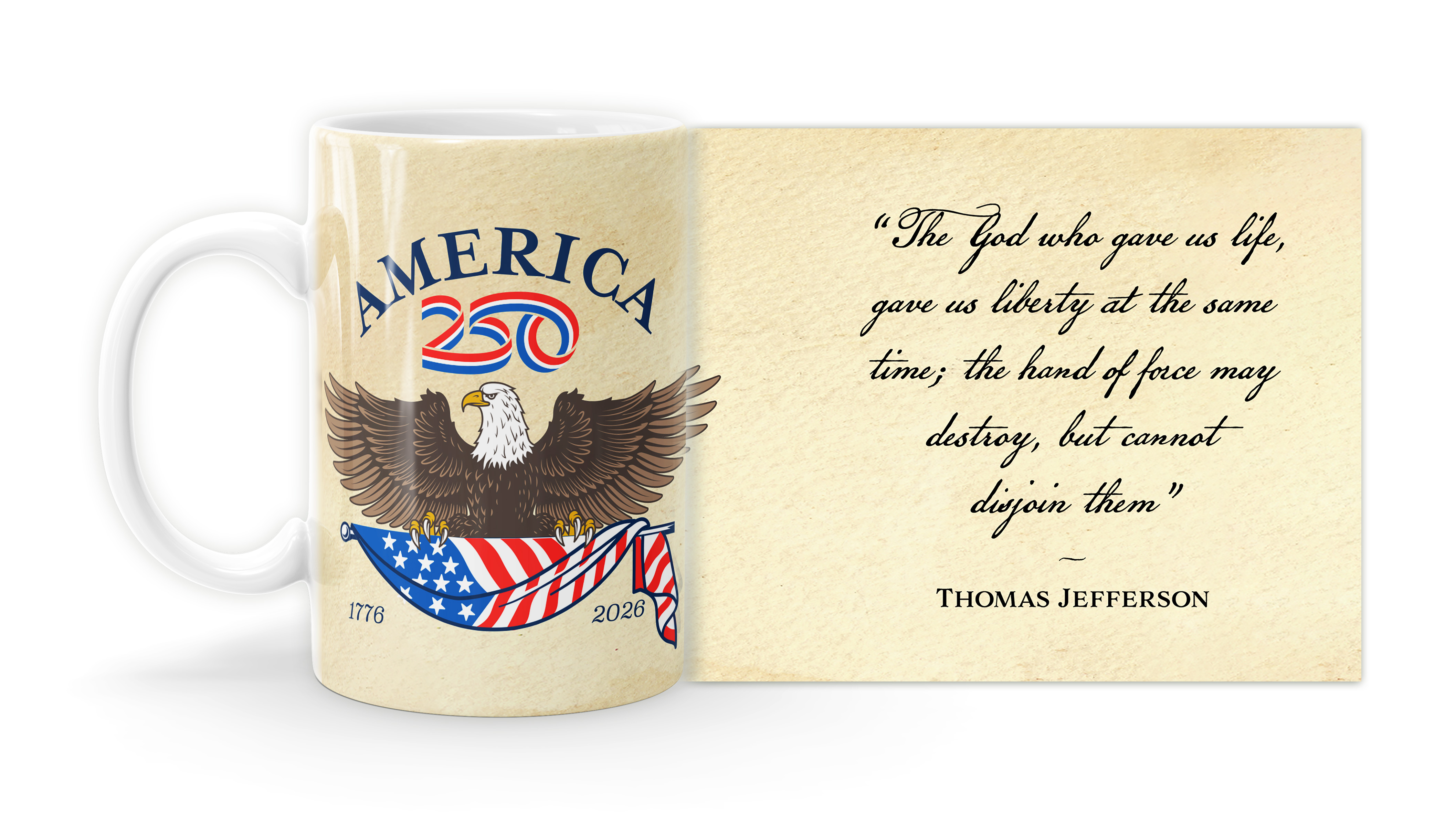 Enjoy your coffee, tea, and hot cocoa in this unique ceramic mug. This 15 oz. high quality coffee mug imprinted in our shops makes a great gift for any event or occasion! This mug features the Thomas JeffersonQuote “The God who gave us life, gave us liberty at the same time; the hand of force may destroy, but cannot disjoin them” with America250 Logo