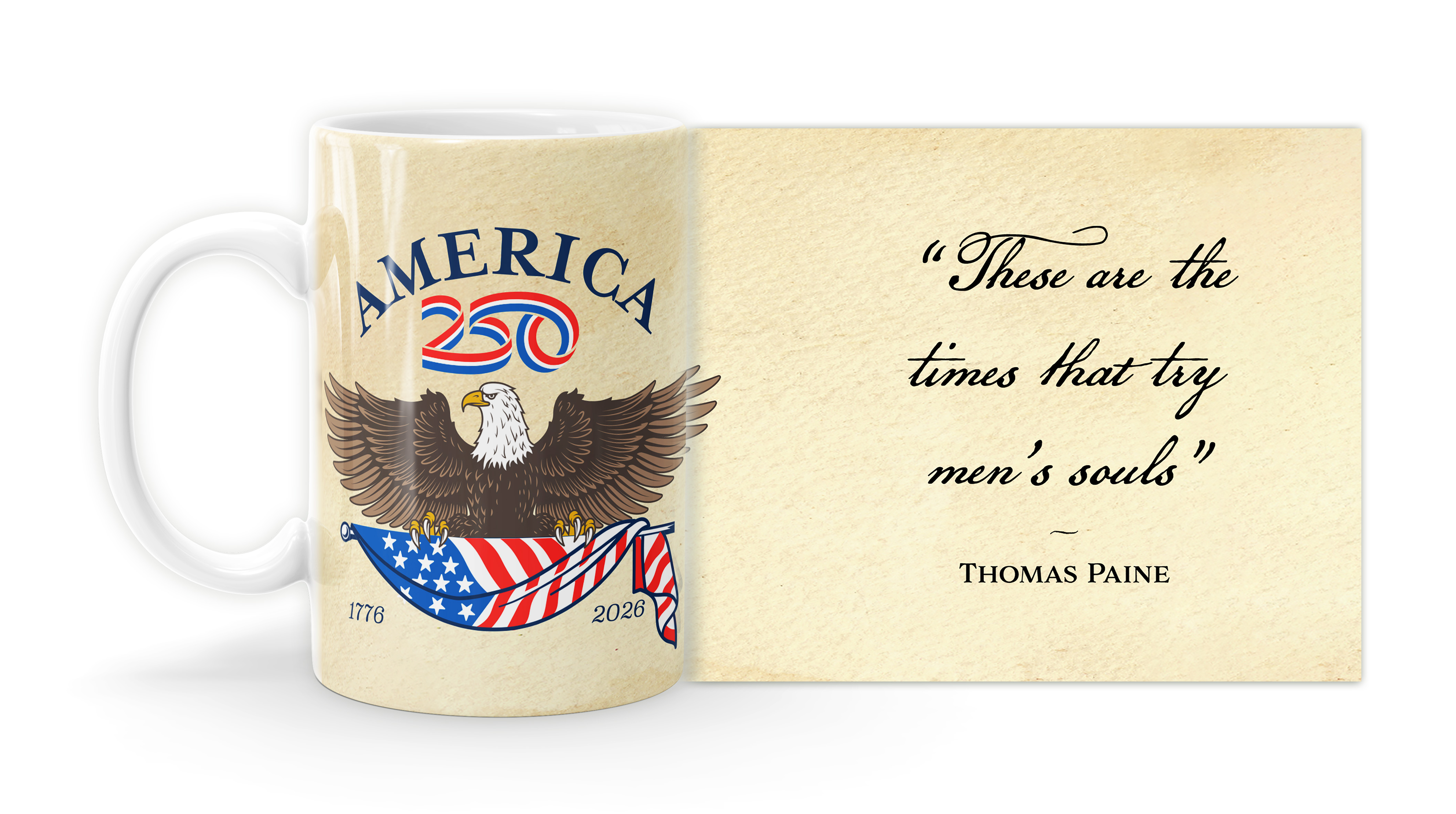 Enjoy your coffee, tea, and hot cocoa in this unique ceramic mug. This 15 oz. high quality coffee mug imprinted in our shops makes a great gift for any event or occasion! This mug features the Thomas PaineQuote "These are the times that try men’s souls." with America250 Logo