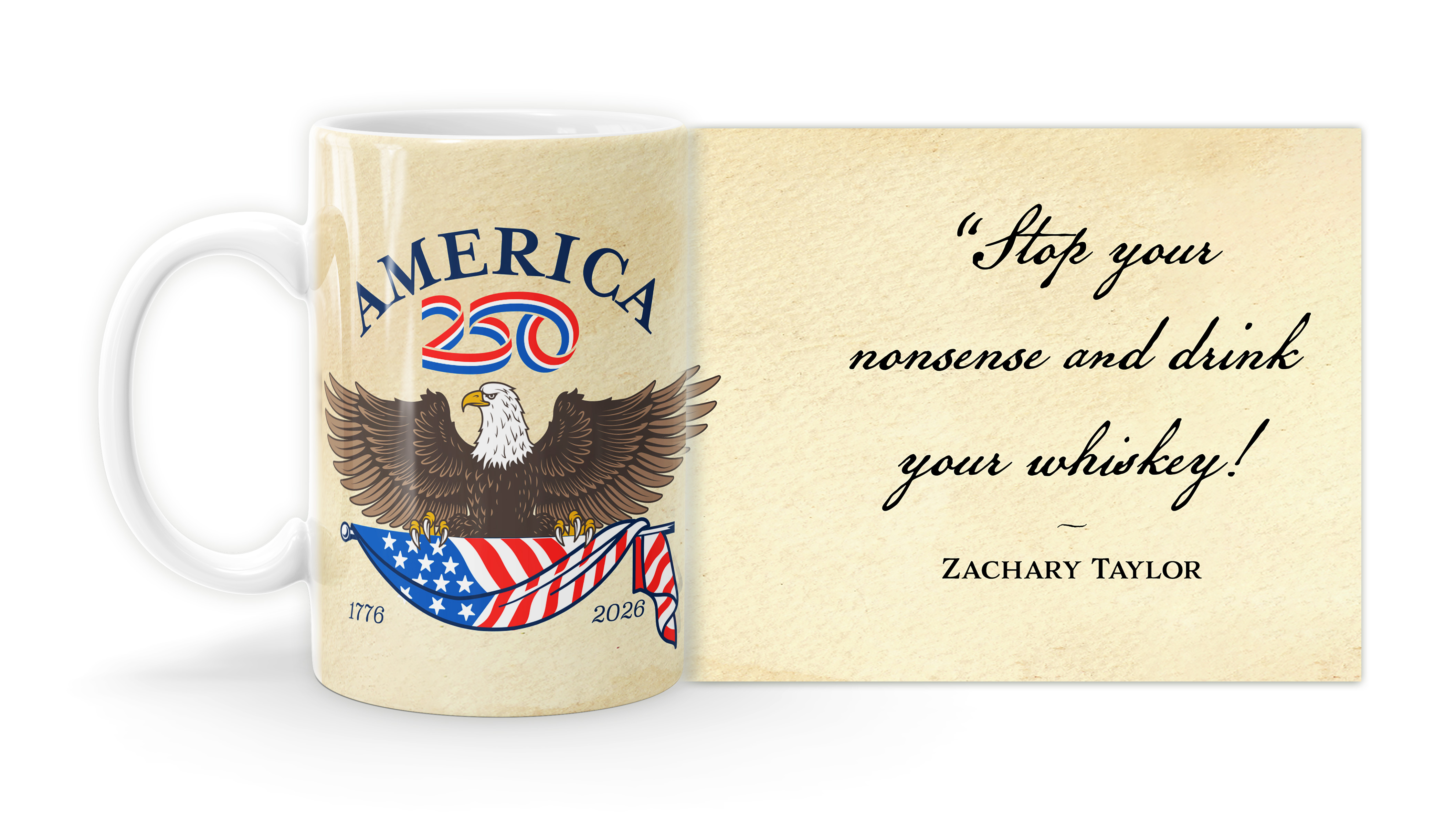 Enjoy your coffee, tea, and hot cocoa in this unique ceramic mug. This 15 oz. high quality coffee mug imprinted in our shops makes a great gift for any event or occasion! This mug features the Zachary Taylor Quote "Stop your nonsense and drink your whiskey!" with America250 Logo ( MUG15X-AM250A-119 ) The AMERICA 250® word mark and logo are trademarks of the U.S. Semiquincentennial Commission and are used by Nelson Enterprises under license.