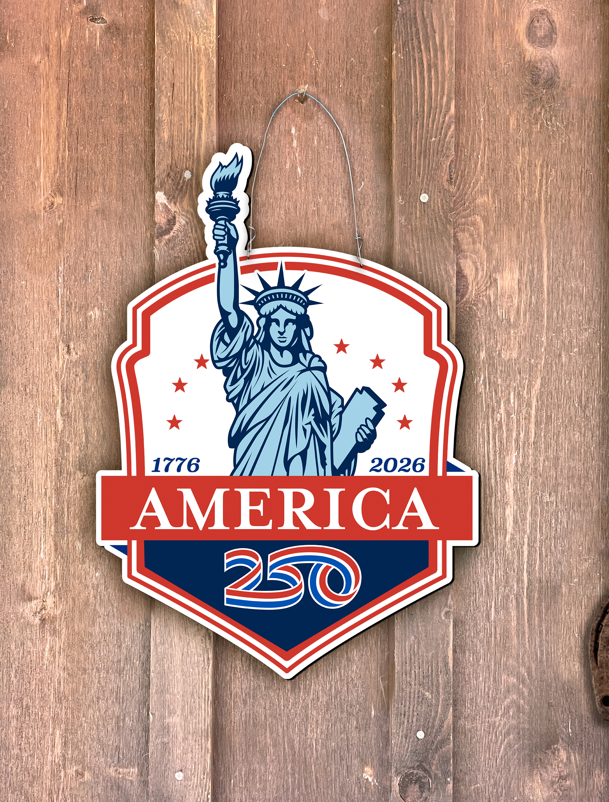 This door hanger is painted with a design of the Statue of Liberty. It makes for a great 4th of July decoration, or as a patriotic gift to celebrate America's 250th birthday! Our door hangers and yard stakes are made from 1/8" thick aluminum composite material, and printed with weather-resistant ink to ensure years of color and style!The AMERICA 250® word mark and logo are trademarks of the U.S. Semiquincentennial Commission and are used by Nelson Enterprises under license.