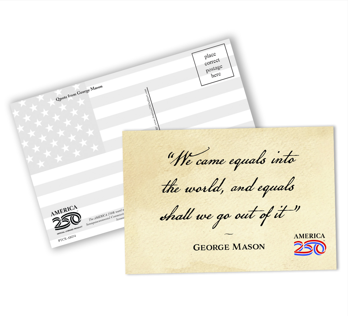 Send a message to friends and family with these Patriotic Postcards! The front features the quote from George Mason: "We came equals into the world, and equals shall we go out of it".  These postcards can be bought as singles, or in a bundle of a dozen.  ( PTC-AM54 ) The AMERICA 250® word mark and logo are trademarks of the U.S. Semiquincentennial Commission and are used by Nelson Enterprises under license.