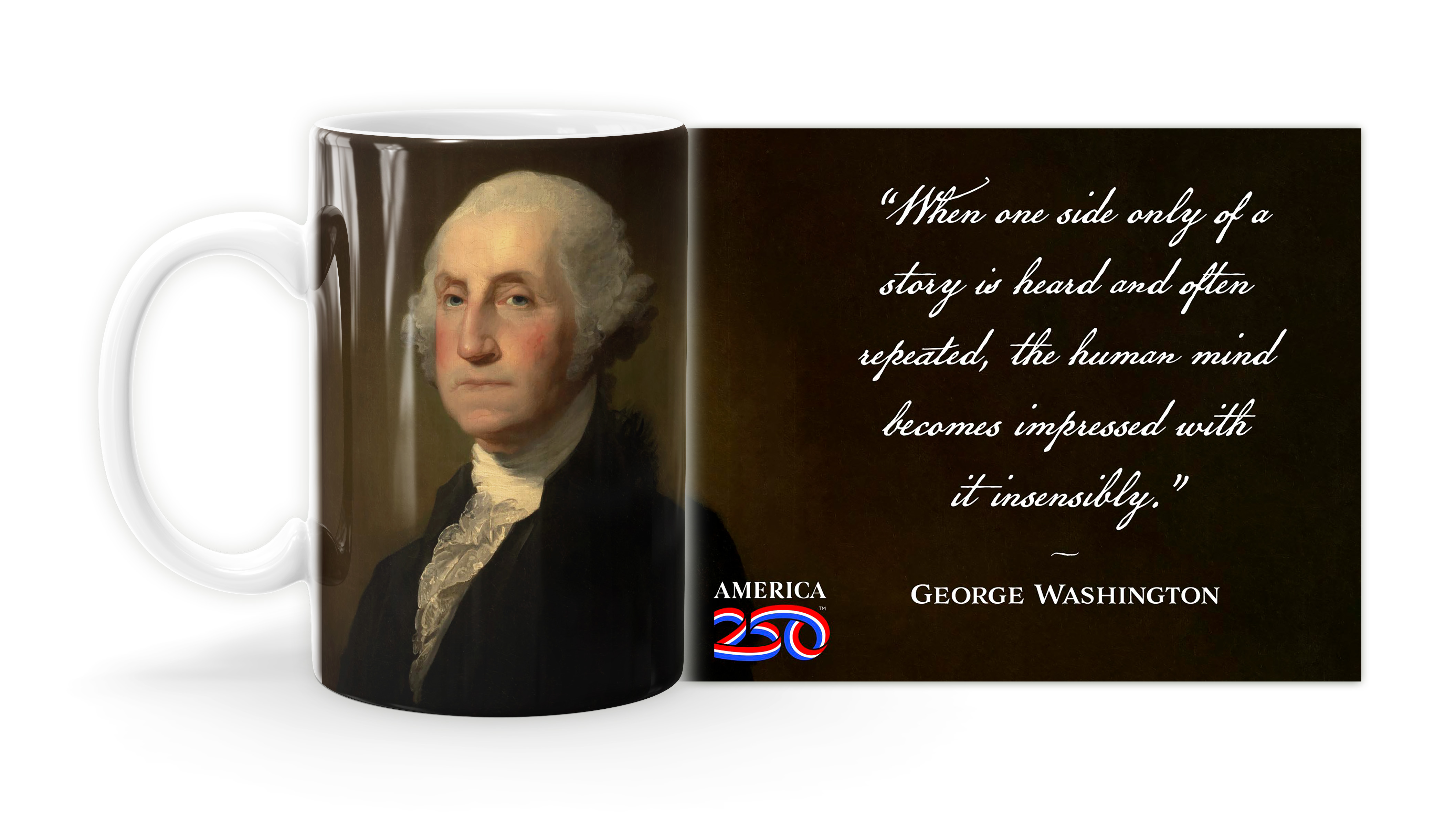 Enjoy your coffee, tea, and hot cocoa in this unique ceramic mug. This 15 oz. high quality coffee mug imprinted in our shops makes a great gift for any event or occasion! This mug features the George Washington Quote "When one side only of a story is heard and often repeated, the human mind becomes impressed with it insensibly.” ( MUG15X-AM07-69 ) The AMERICA 250® word mark and logo are trademarks of the U.S. Semiquincentennial Commission and are used by Nelson Enterprises under license.