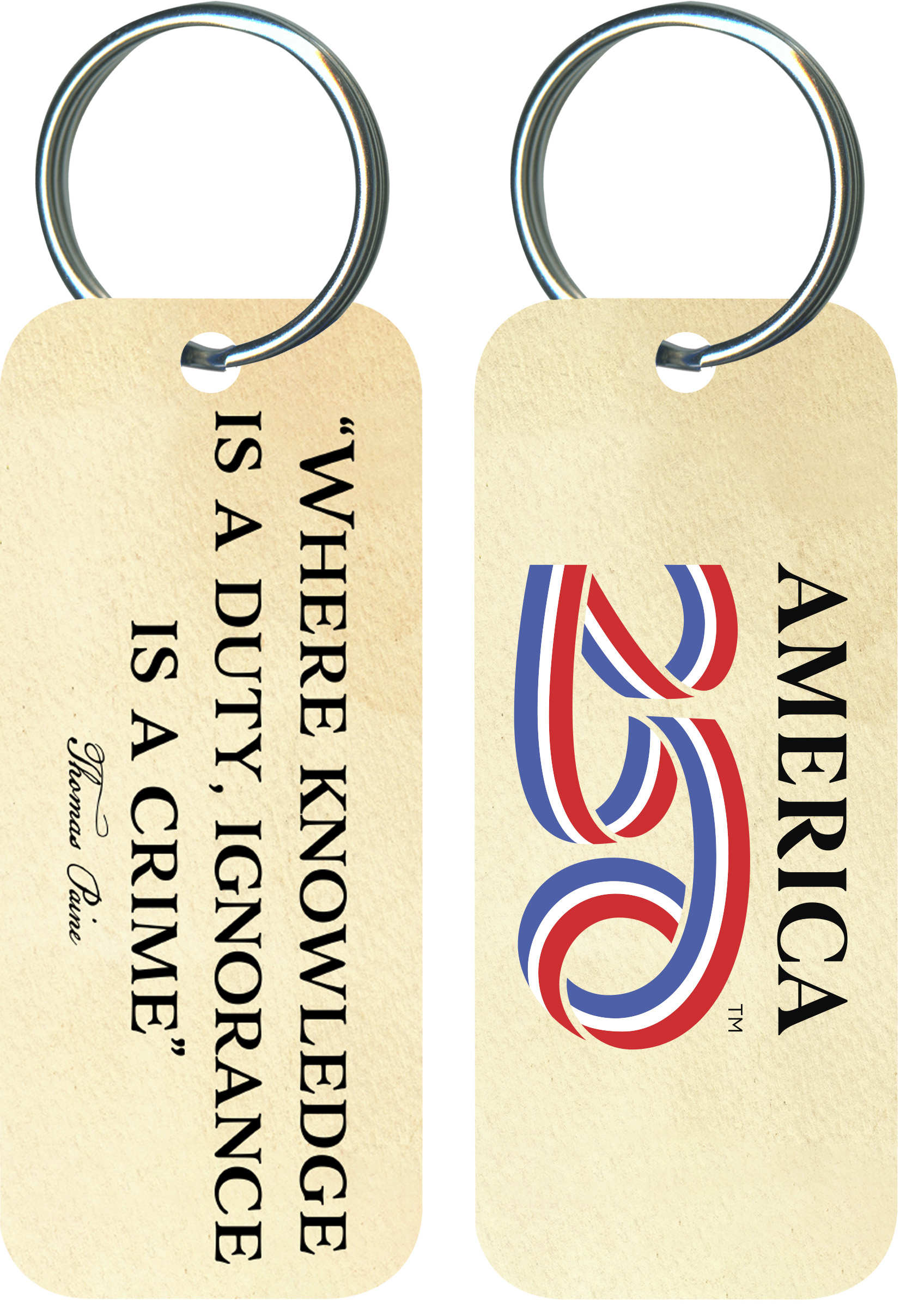 Proudly display your patriotism everywhere you go with this unique, glossy keychain! This high-quality, beautiful gift makes a great addition to your keychain and the perfect gift for the drivers in your circle of family and friends! This keychain features the quote from Thomas Paine: "Where knowledge is a duty, ignorance is a crime".  ( KCO-AM50 ) The AMERICA 250® word mark and logo are trademarks of the U.S. Semiquincentennial Commission and are used by Nelson Enterprises under license.